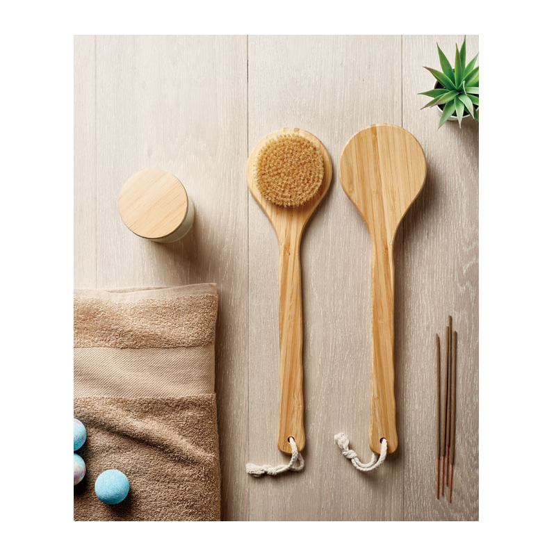 Brosse de bain en bambou avec corde de jute et poils en nylon.