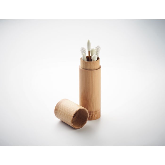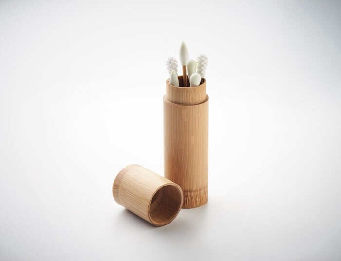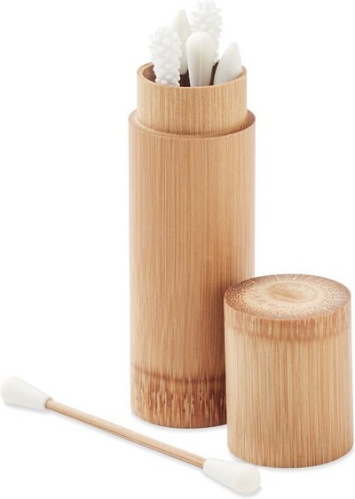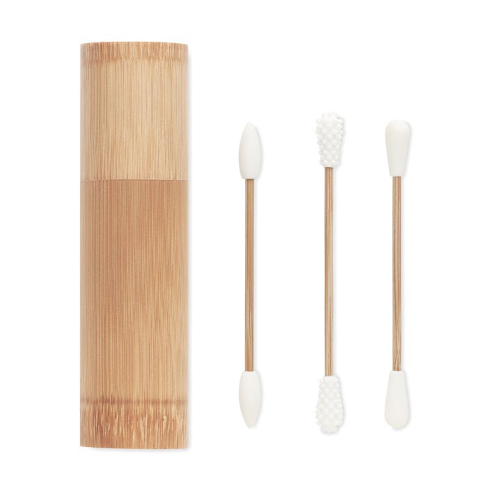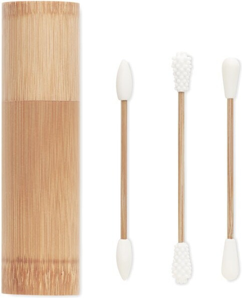 6 cotons-tiges réutilisables à double extrémité en silicone, bâtonnet en bambou, présentés dans une boîte en bambou.