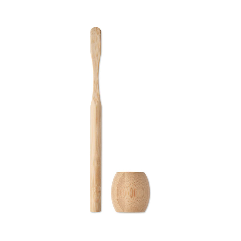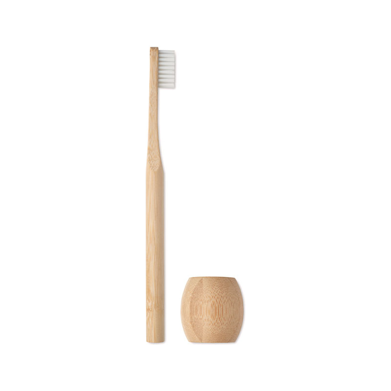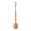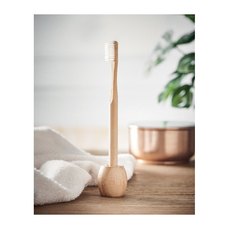Brosse à dents avec manche en bambou et brosses en nylon avec support. Présentée dans une boîte en papier kraft.