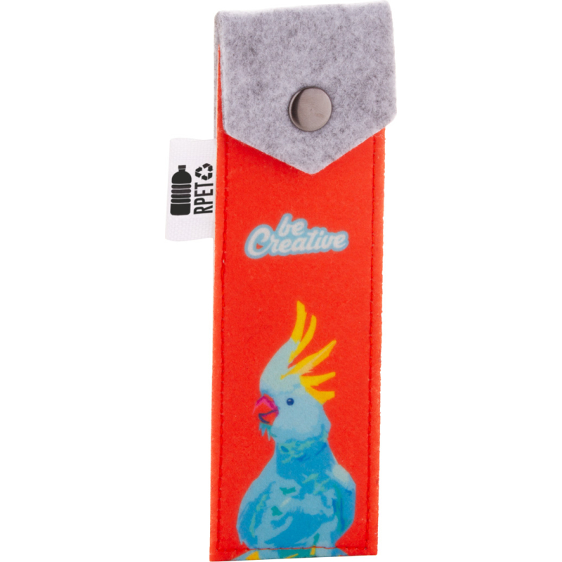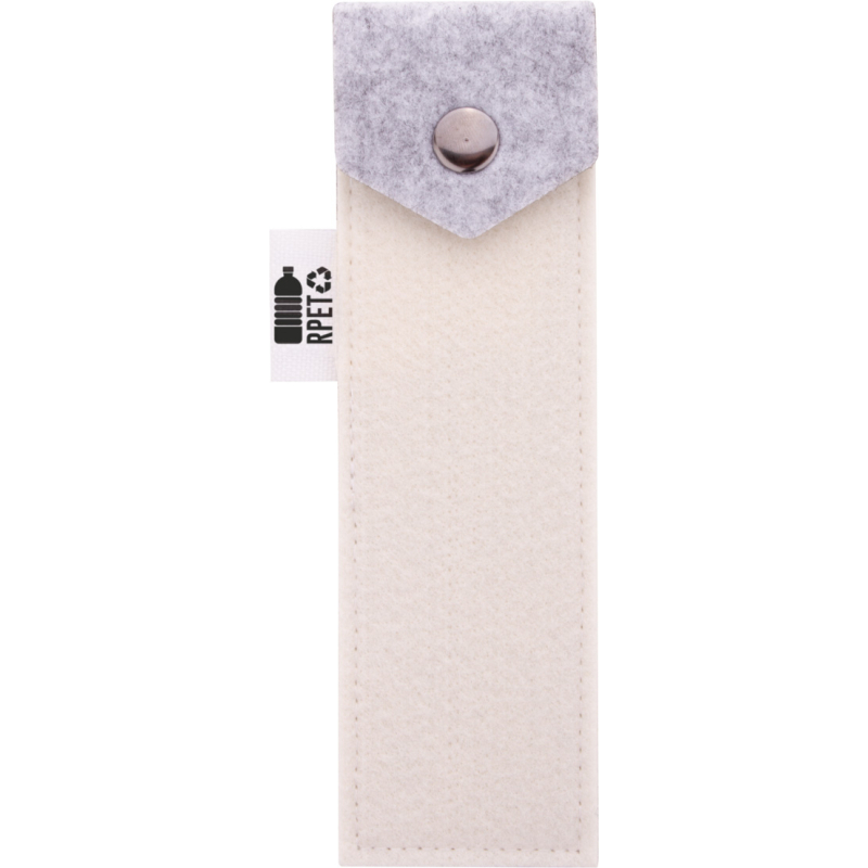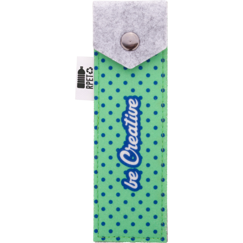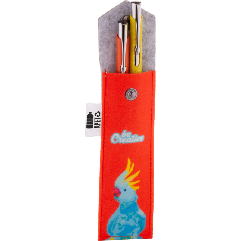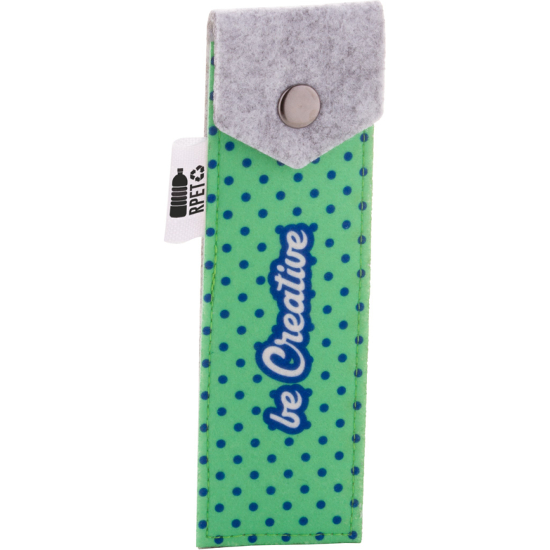 Trousse à stylos feutre en RPET fait sur mesure avec face avant imprimée en sublimation, avec fermeture à bouton-pression. Labélisée RPET. Le prix comprend l'impression en sublimation. Quantité minimale : 50 pièces.