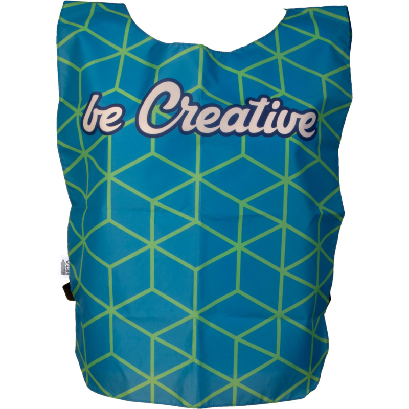 Chasuble de sport en polyester RPET 190T sur mesure pour adultes. Impression en sublimation sur toute la surface et labélisée RPET. Quantité minimale : 50 pièces.