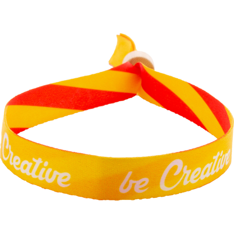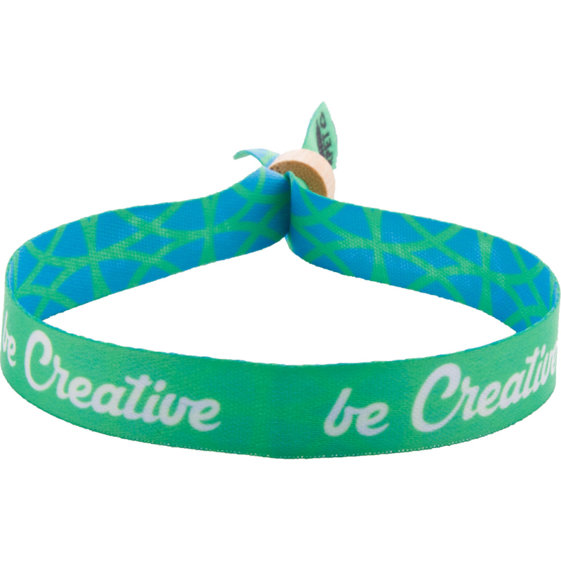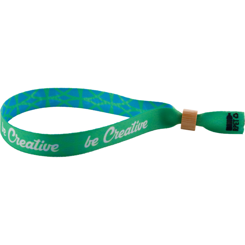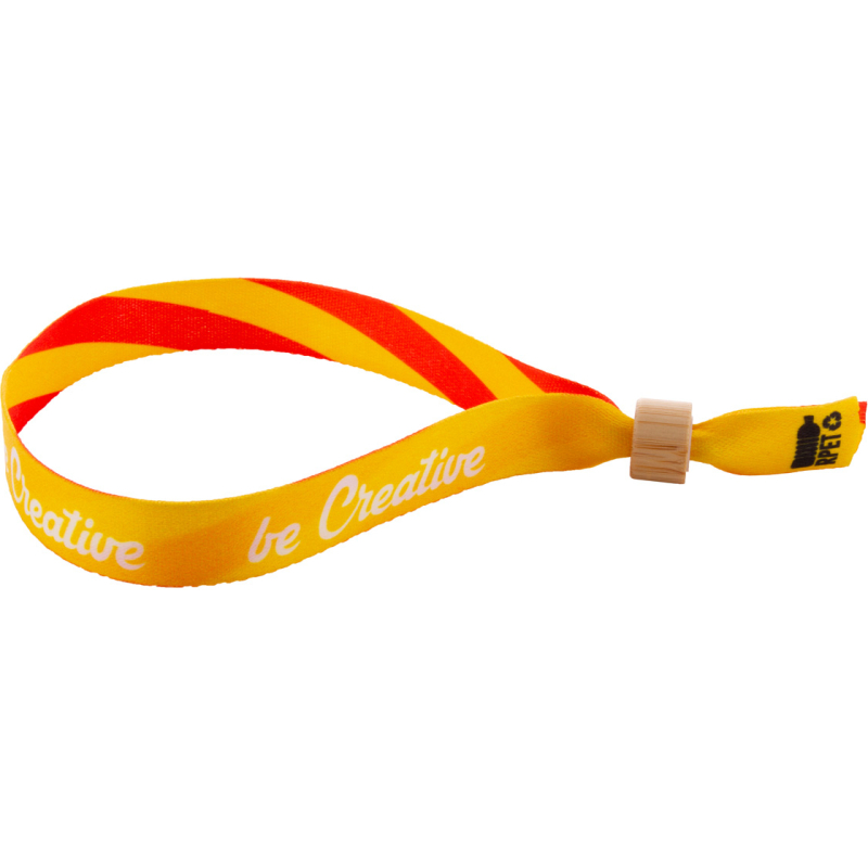 Bracelet festival en polyester RPET sur mesure avec fermoir de sécurité en bambou. Impression en sublimation des deux côtés. Quantité minimale : 100 pièces.