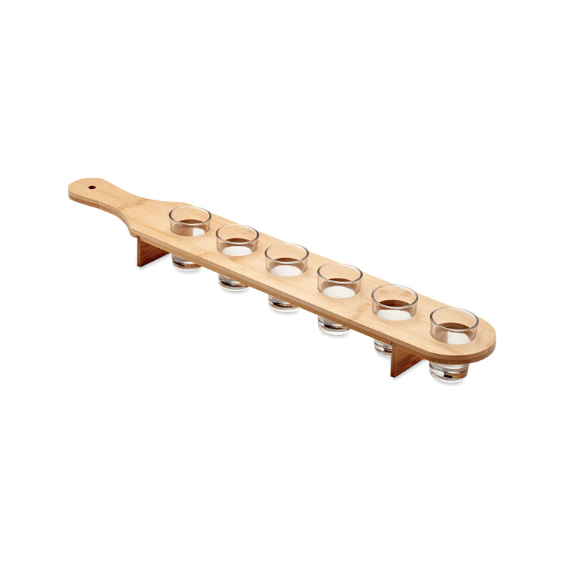 Ensemble de 6 verres à shot sur un plateau en bambou. Capacité : 20 ml.