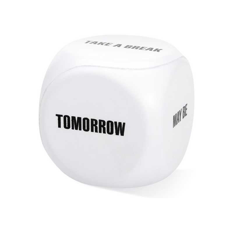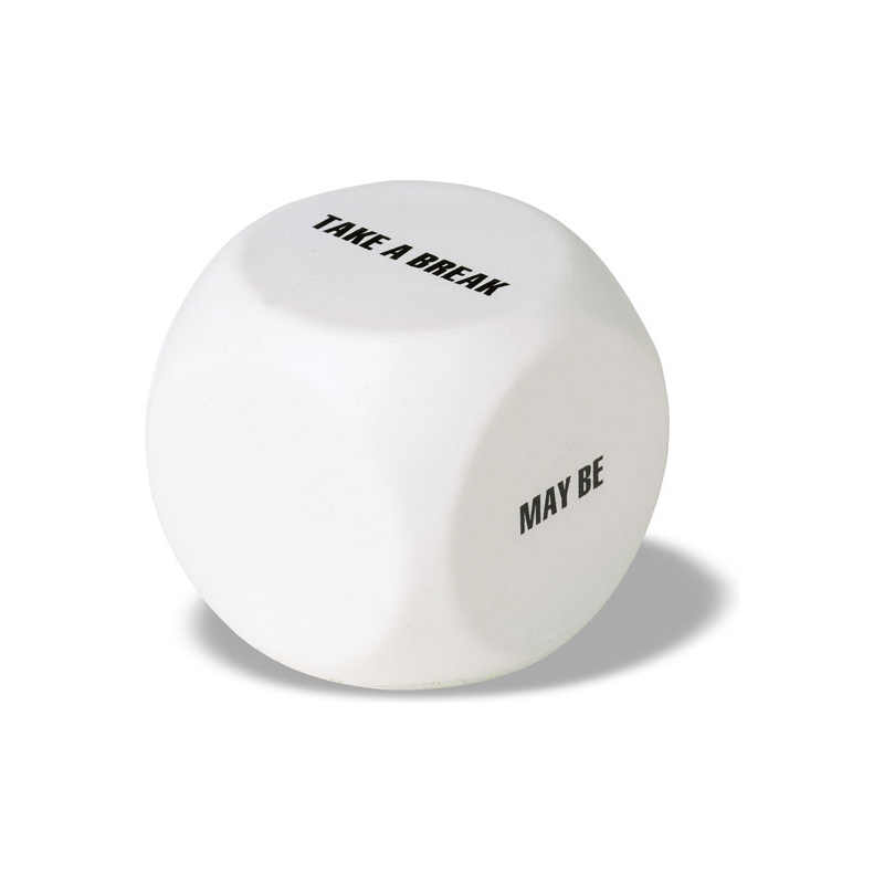 Balle antistress 'dé' (Take a break, tomorrow, may be, yes, no). En PU.