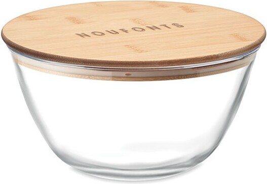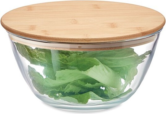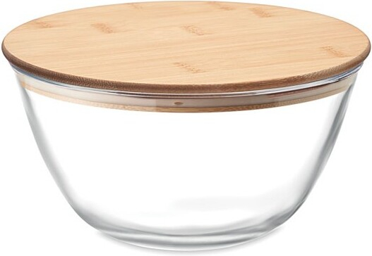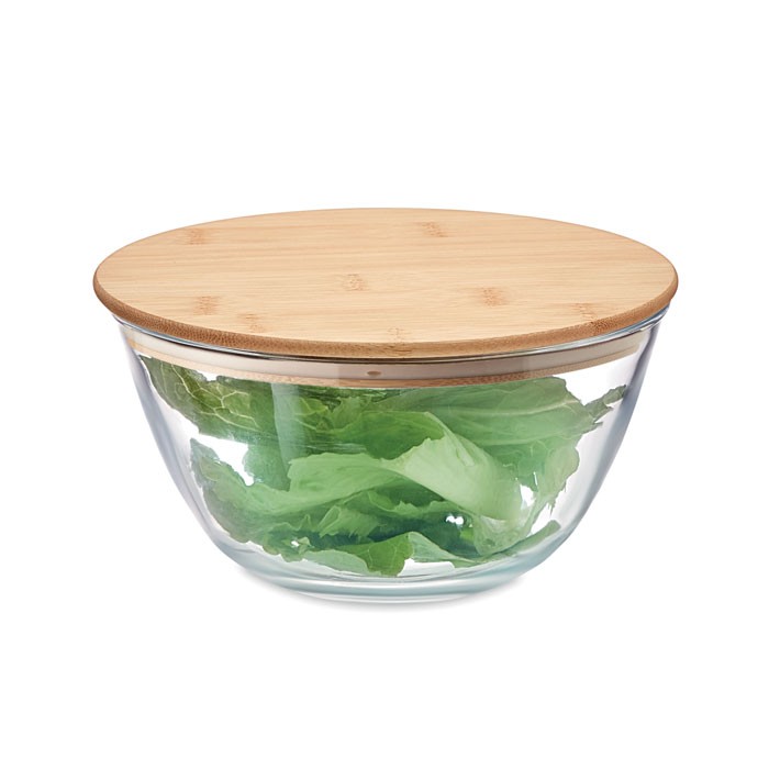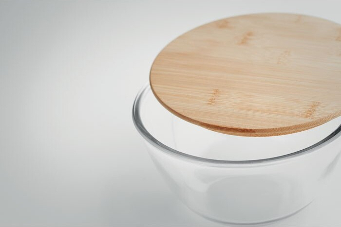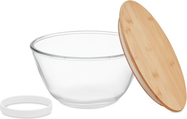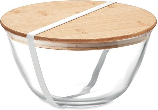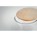 Bol à salade en verre borosilicate avec couvercle en bambou et bande en silicone. Contenance : 1200 ml.
