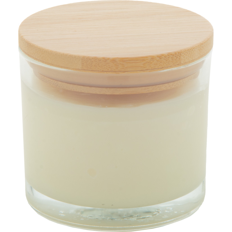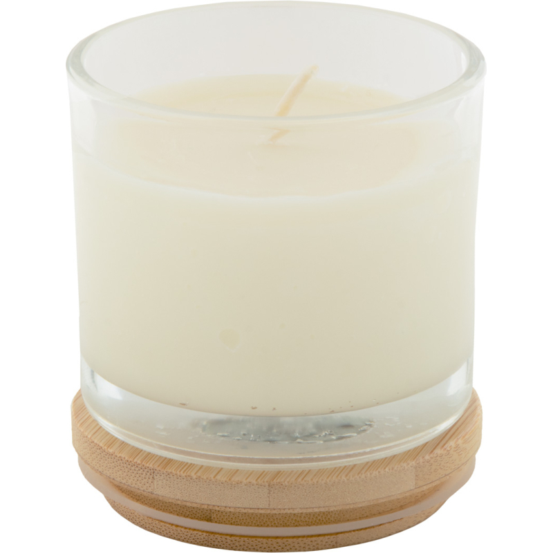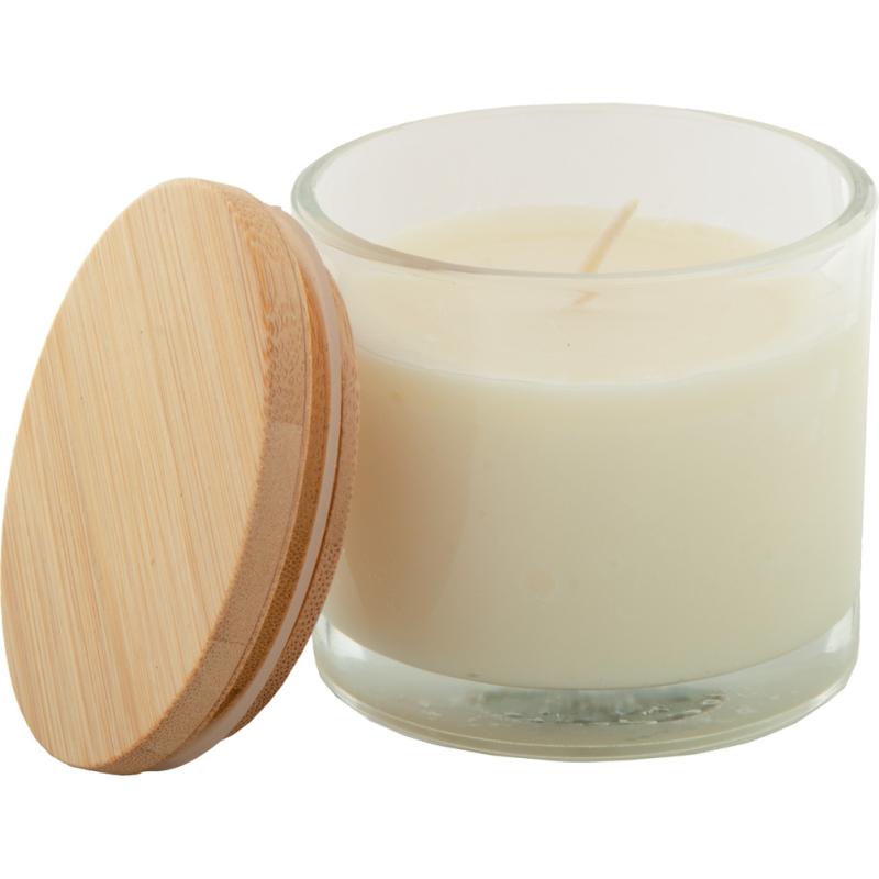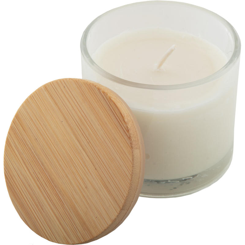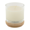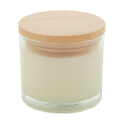 Bougie en cire végétale parfumée à la vanille dans un verre avec couvercle en bambou. Avec 95 grammes de cire. Livrée dans une boîte en papier kraft.