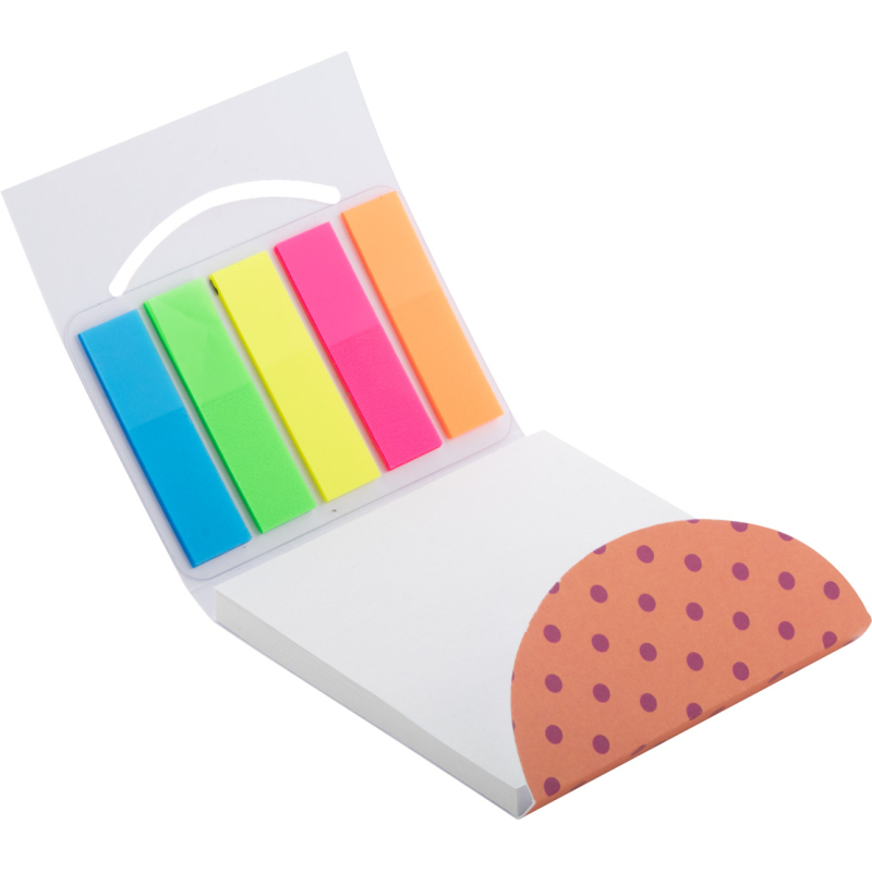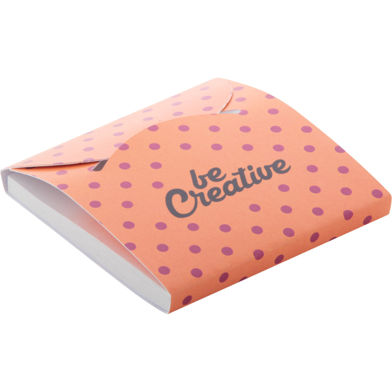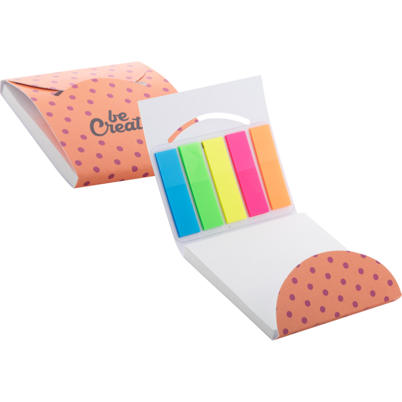 Bloc-notes autocollant sur-mesure recouvert de papier. Comprend 50 feuilles de papier recyclé (75×75 mm) et 100 marqueurs de page de film plastifié en 5 couleurs assorties (44×12 mm). Le prix comprend la couverture extérieure imprimée en quadri. Quantité minimale de commande: 100 pièces.