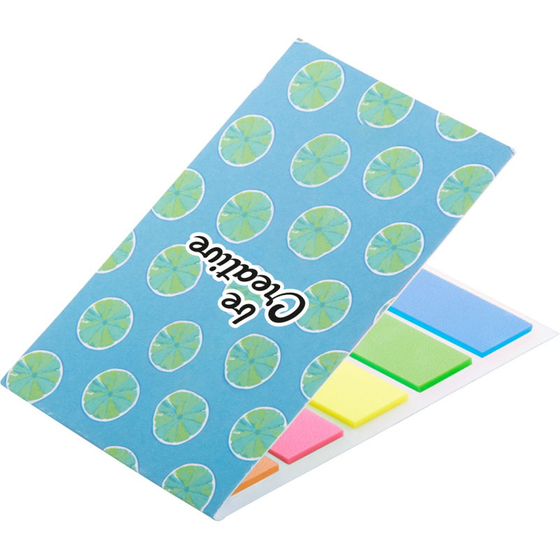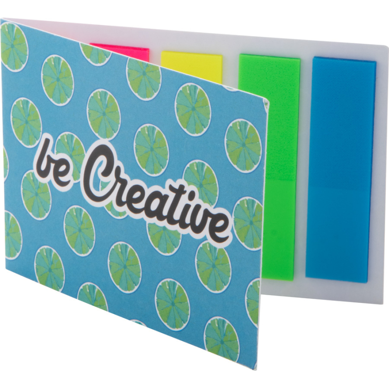 Marqueurs de page recouverts de papier sur-mesure. Comprend 100 marqueurs de page de film plastifié en 5 couleurs assorties (44×12 mm). Le prix comprend la couverture extérieure imprimée en quadri. Quantité minimale de commande: 100 pièces.