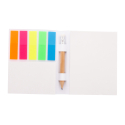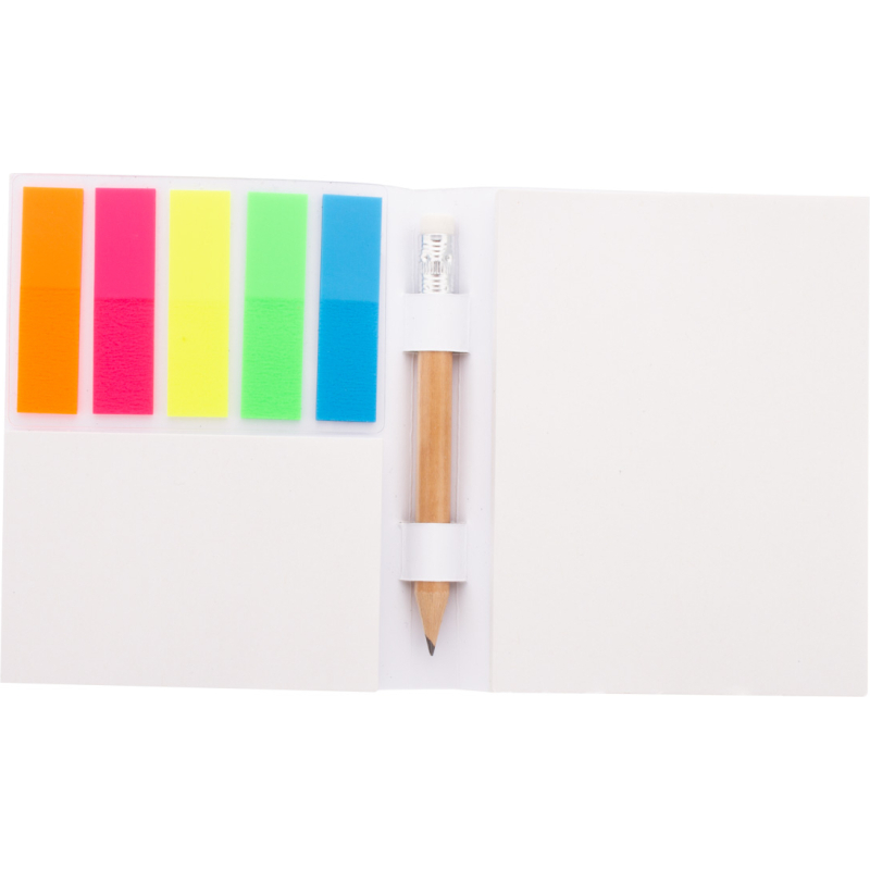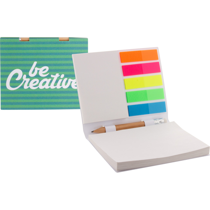 Bloc-notes adhésif sur mesure recouvert de papier avec un mini crayon en bois. Comprend des notes autocollantes en papier recyclé de 2 tailles (50 feuilles de 100×75 mm, 25 feuilles de 50×75 mm) et 100 marque-pages en film plastique de 5 couleurs assorties (12×44 mm). Le prix comprend la couverture extérieure imprimée en quadri. Quantité minimale : 100 pièces.