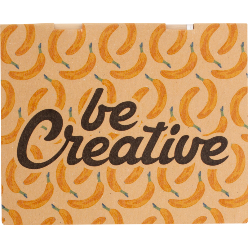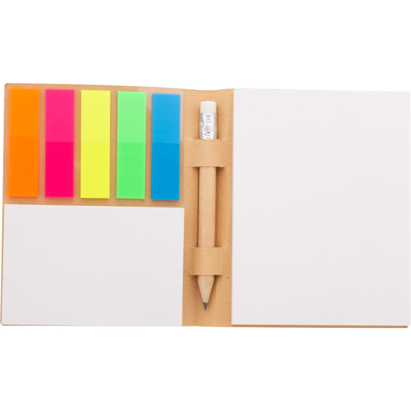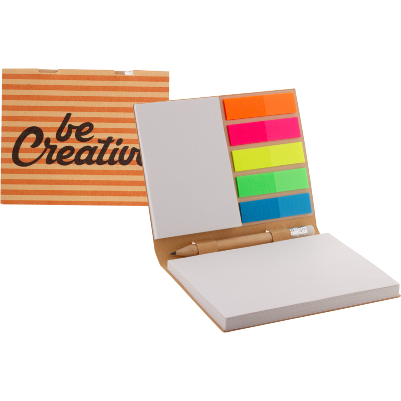 Bloc-notes autocollant sur mesure recouvert de papier kraft recyclé avec mini crayon en bois. Comprend des notes autocollantes en papier recyclé de 2 tailles (50 feuilles de 100×75 mm, 25 feuilles de 50×75 mm) et 100 marque-pages en film plastique de 5 couleurs assorties (44×12 mm). Le prix comprend la couverture extérieure imprimée en quadri. Quantité minimale : 100 pièces.