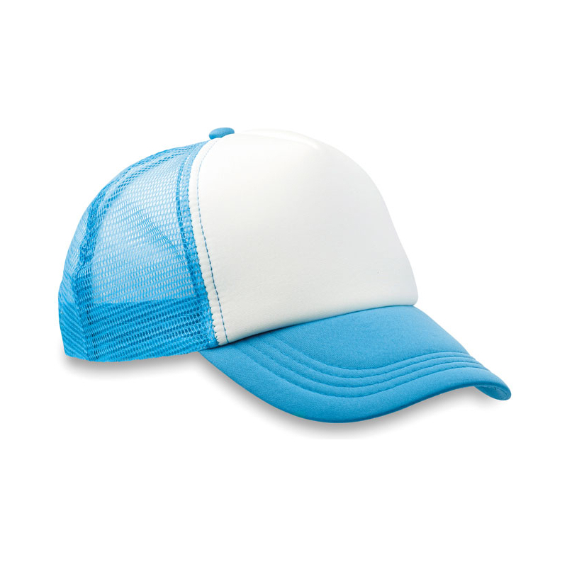 Casquette 5 pans en polyester 140-150 gr/m2 fermeture par claquement. Panneau frontal et visière en jersey polyester doublé. 4 pans en filet de couleur. Taille 7 1/4.