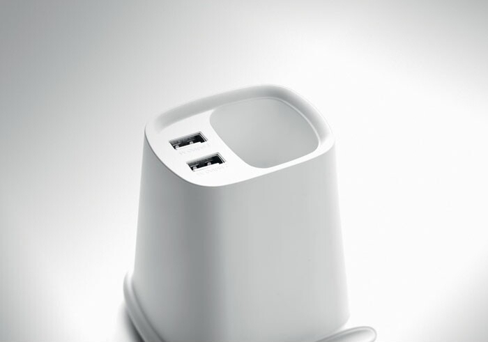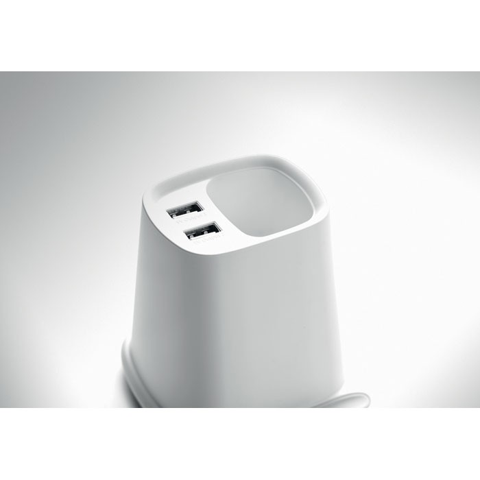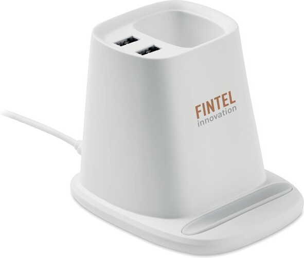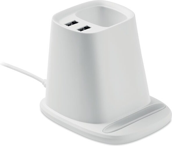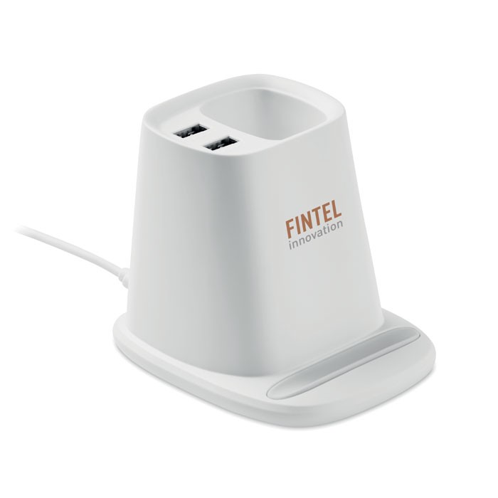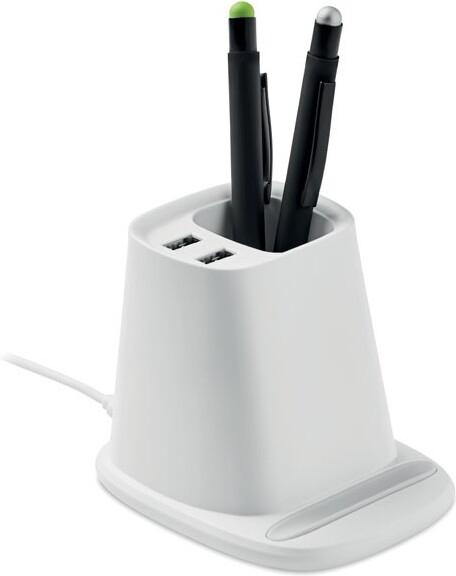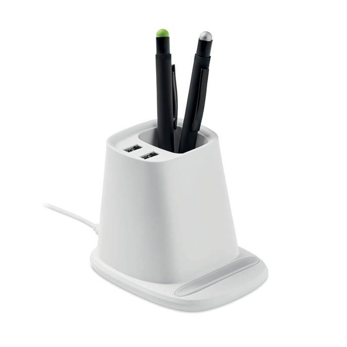 Porte-stylo de bureau avec support pour téléphone à chargement sans fil rapide 10W et 2 ports USB pour la recharge. Sortie : DC 9V/1.1A. Compatible avec les derniers Androïdes, iPhone® 8, X et plus récents.