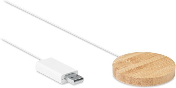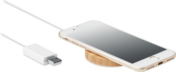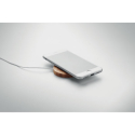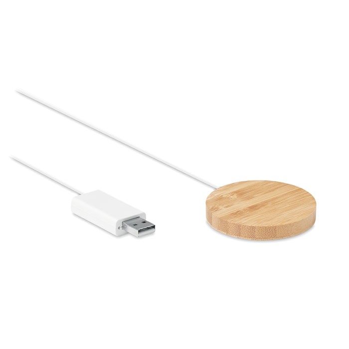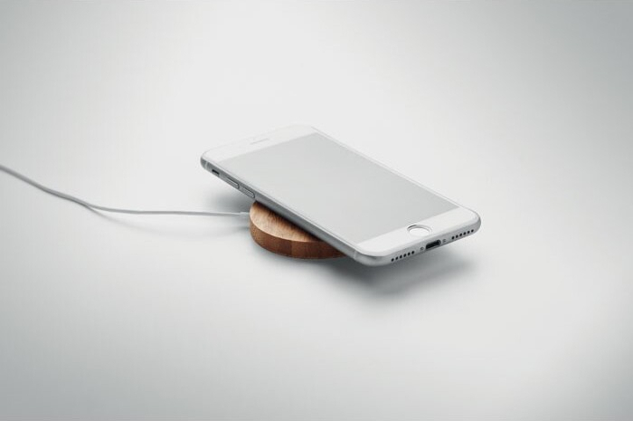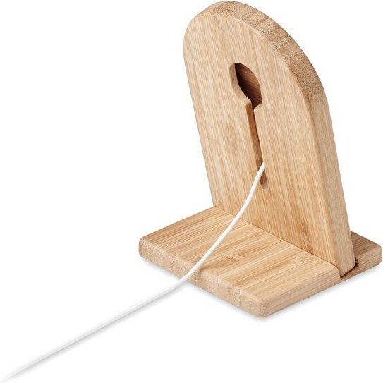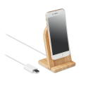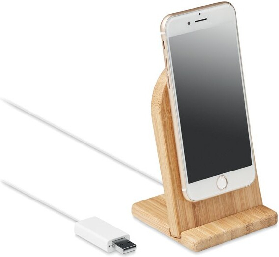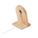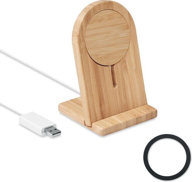 Chargeur sans fil magnétique en bambou avec support. Sortie : DC 9V/1.1A (10W). Compatible avec les iPhone® 12 et plus récents. Un anneau métallique magnétique supplémentaire est inclus pour les téléphones non magnétiques.