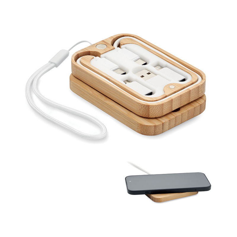 chargeur sans fil 15W avec câble de charge 3-en-1 avec connecteurs assortis. Présenté dans une boîte en bambou à fermeture magnétique avec sangle. Câble Type-C vers Type C, C vers USB-A, C vers micro-B, connecteurs C.