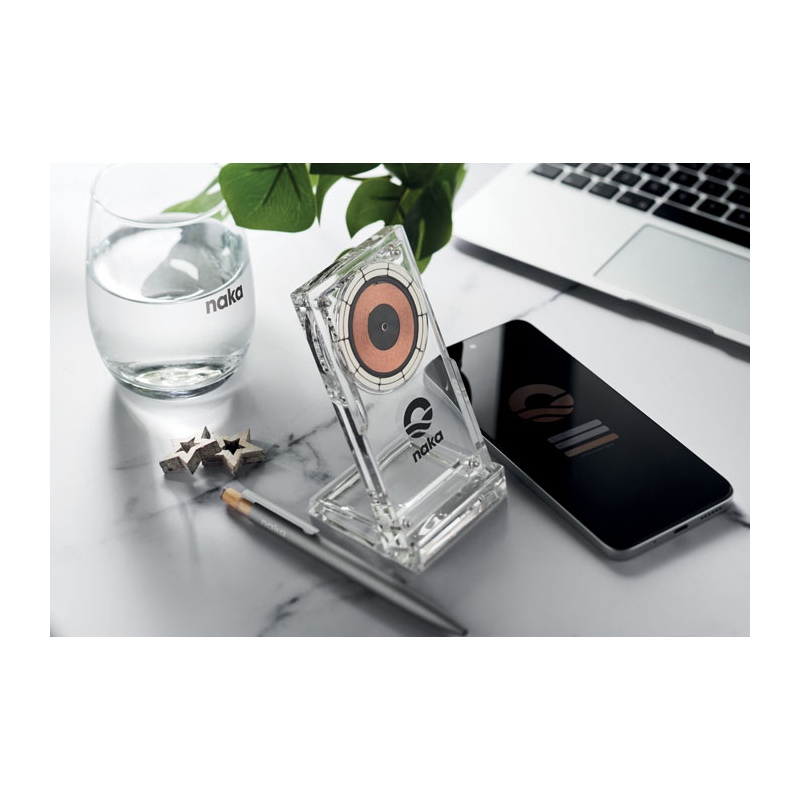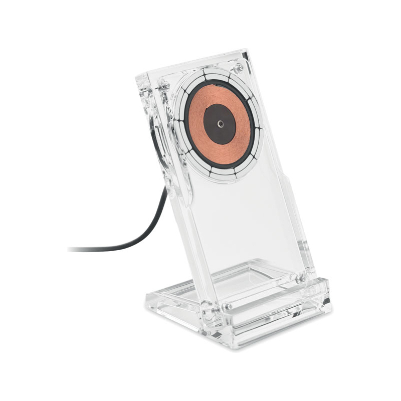 Chargeur sans fil magnétique (15W) en acrylique avec support téléphone. Lorsqu'il est connecté à une source d'alimentation, il charge votre appareil mobile sans fil. Sortie : 9V/1,67A (15W) pour une charge rapide.