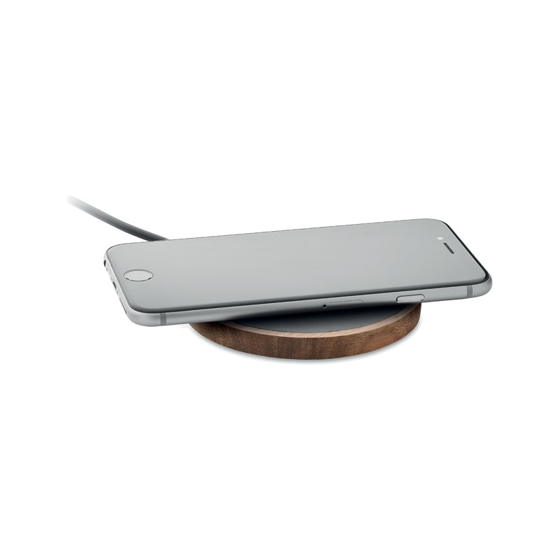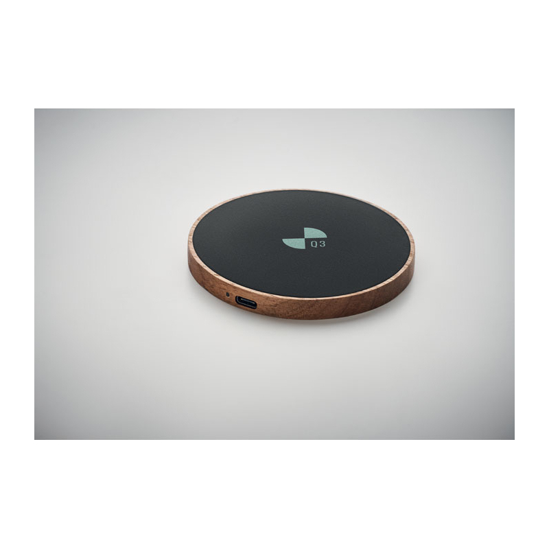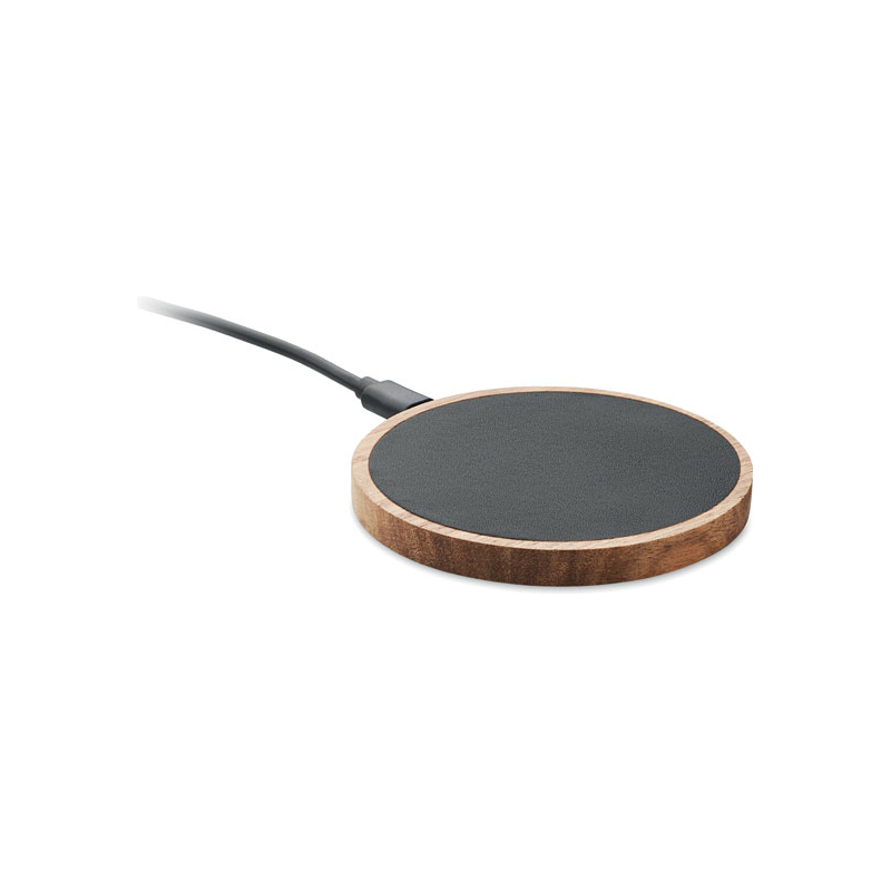 Chargeur sans fil en bois d'acacia et 58% de PU recyclé . Connectez le à votre ordinateur, placez-y le smartphone pour le charger. Sortie : DC 9V/1.67A (15W). Compatible avec tous les appareils compatibles QI tels que les derniers Androïdes, iPhone® 12, X et plus récents.