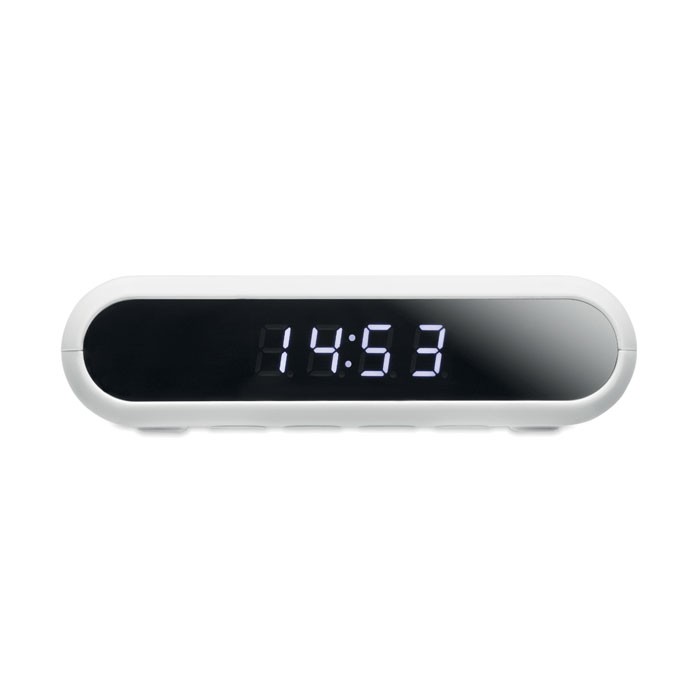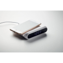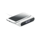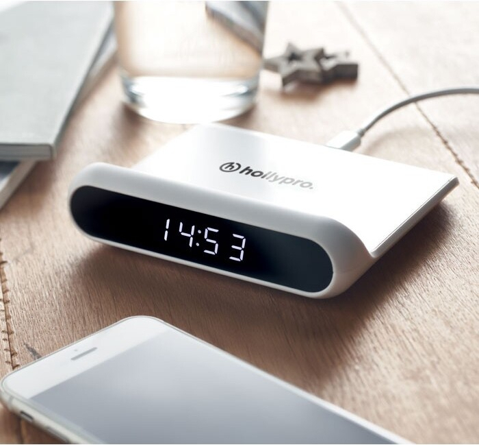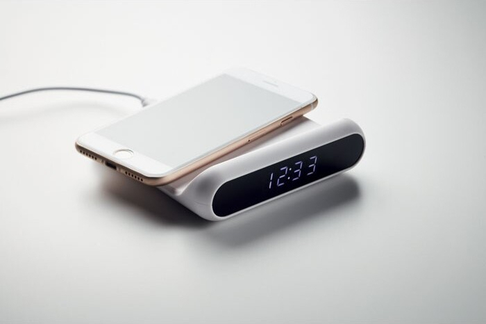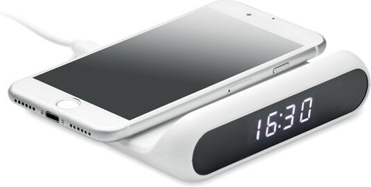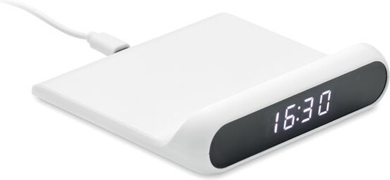 Chargeur sans fil 10W comprenant un réveil avec affichage de l'heure par LED blanches dans un boîtier en ABS. Contient un câble de chargement USB de type C. Sortie : DC 9V/1.10A (10W) pour une charge rapide. Compatible avec les derniers Androïdes, iPhone® 8, X et plus récents.