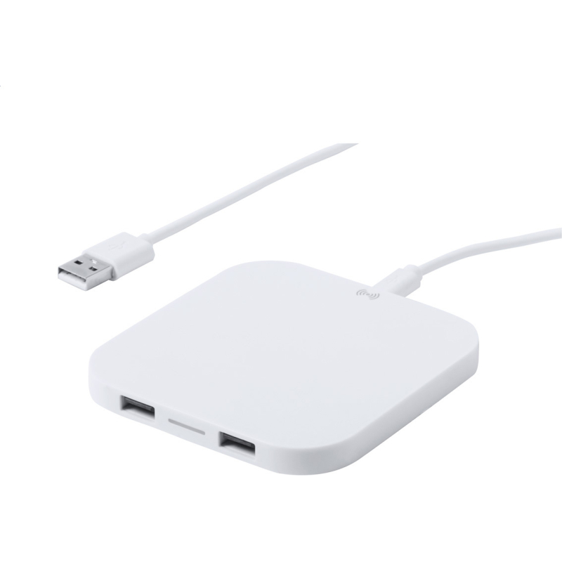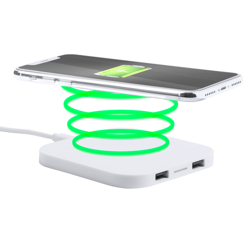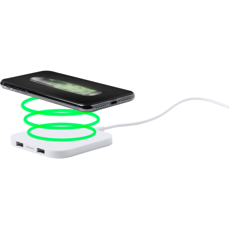 Chargeur sans fil en plastique avec 2 ports. Sortie max. 2100 mA.