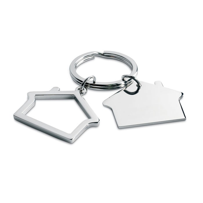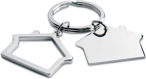 Porte-clés en alliage de zinc forme maison. Emballage boite carton blanche.