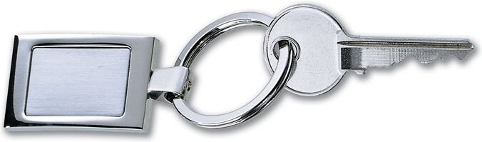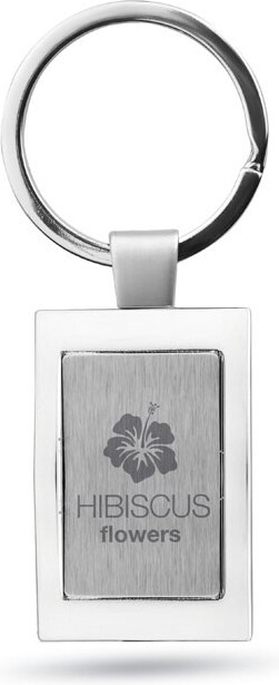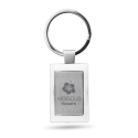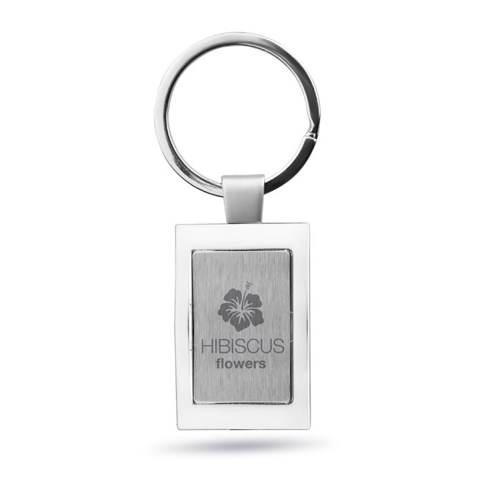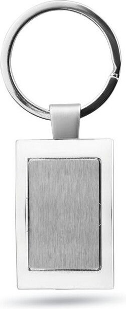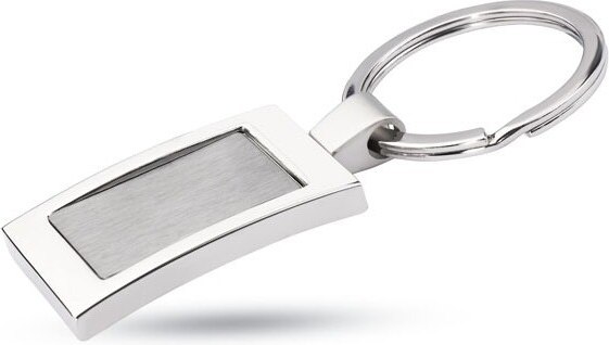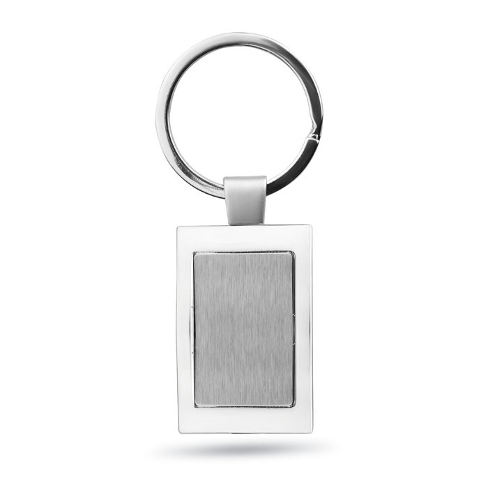 Porte-clés rectangulaire en alliage de zinc chromé avec espace mat. Emballage boite cadeau.