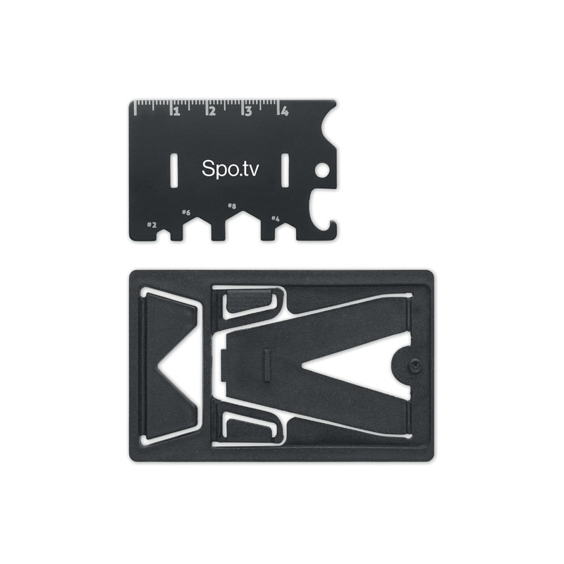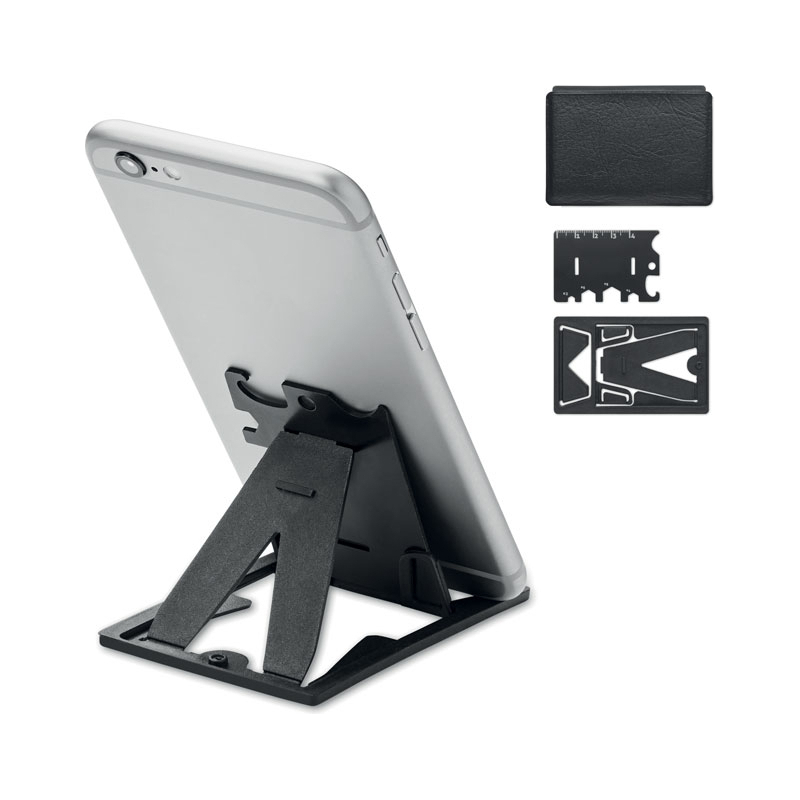Multi-outils en acier inoxydable et PP avec support de téléphone à 6 outils dans une pochette en PU. Il comprend des tournevis, une règle, une clé hexagonale et un décapsuleur.