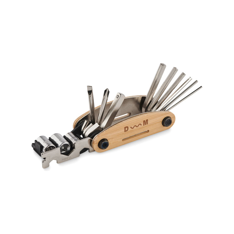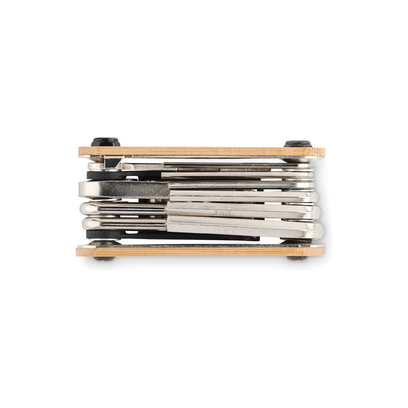 Outil de poche multifonction en acier inoxydable avec revêtement en bambou. 11 fonctions. Il comprend : clés hexagonales, clé plate, adaptateur, tournevis cruciforme et clé à douille.