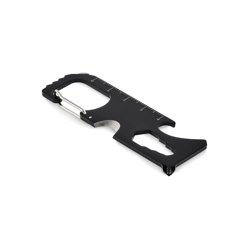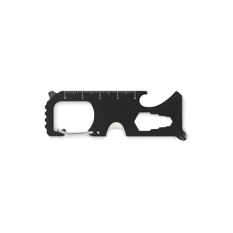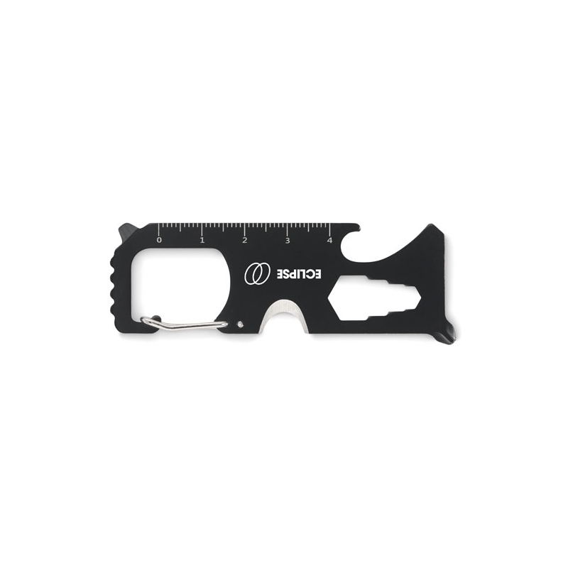 Multi-outil de poche en acier inoxydable. 8 fonctions. Il comprend : une scie à dents, un coupe-fil, une clé, un tournevis cruciforme, un tournevis plat, une règle, un décapsuleur et un porte-clés.