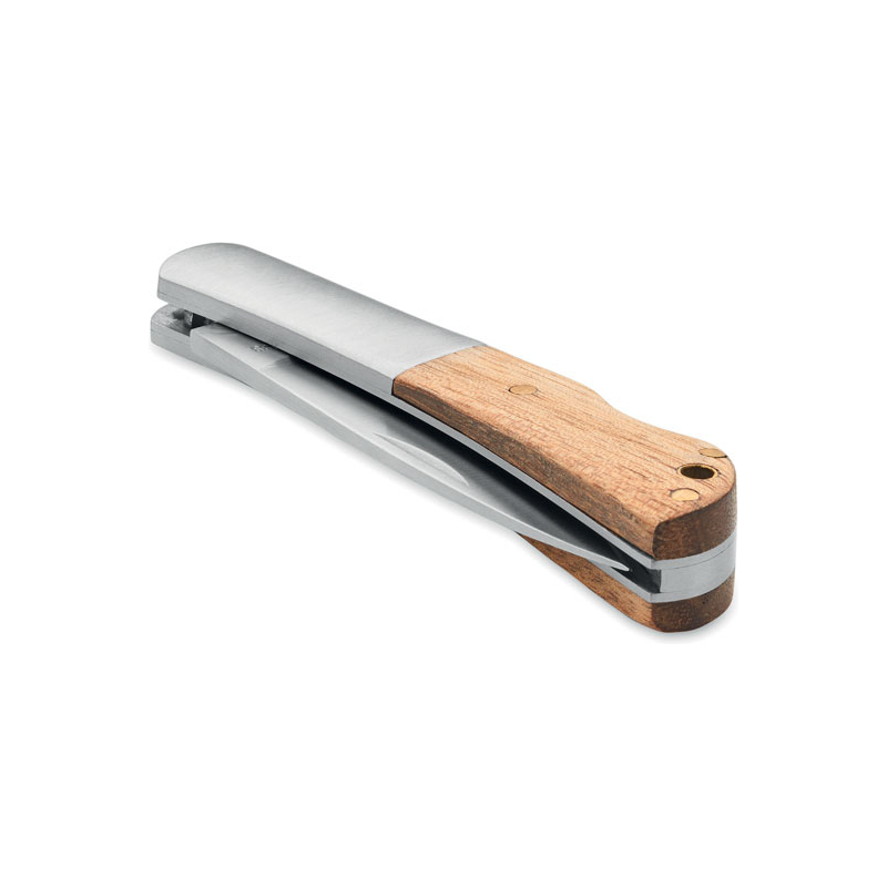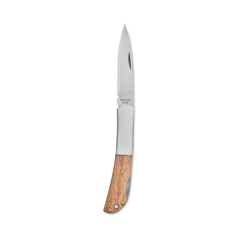 Couteau pliable en acier inoxydable avec manche en bois d'acacia. Longueur de la lame : 6 cm.