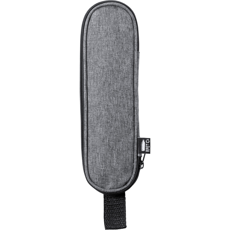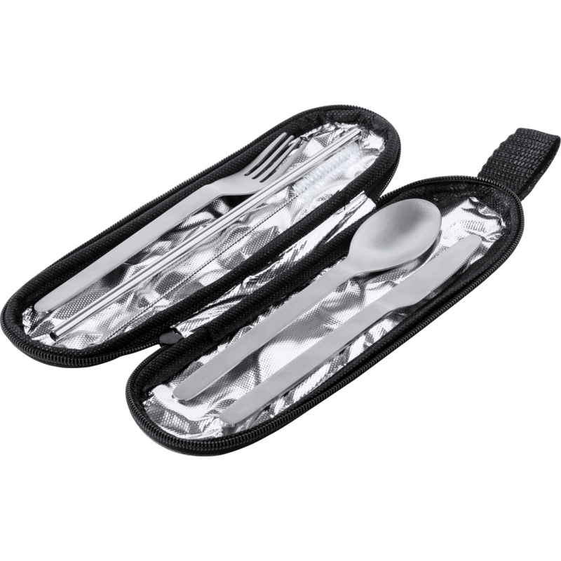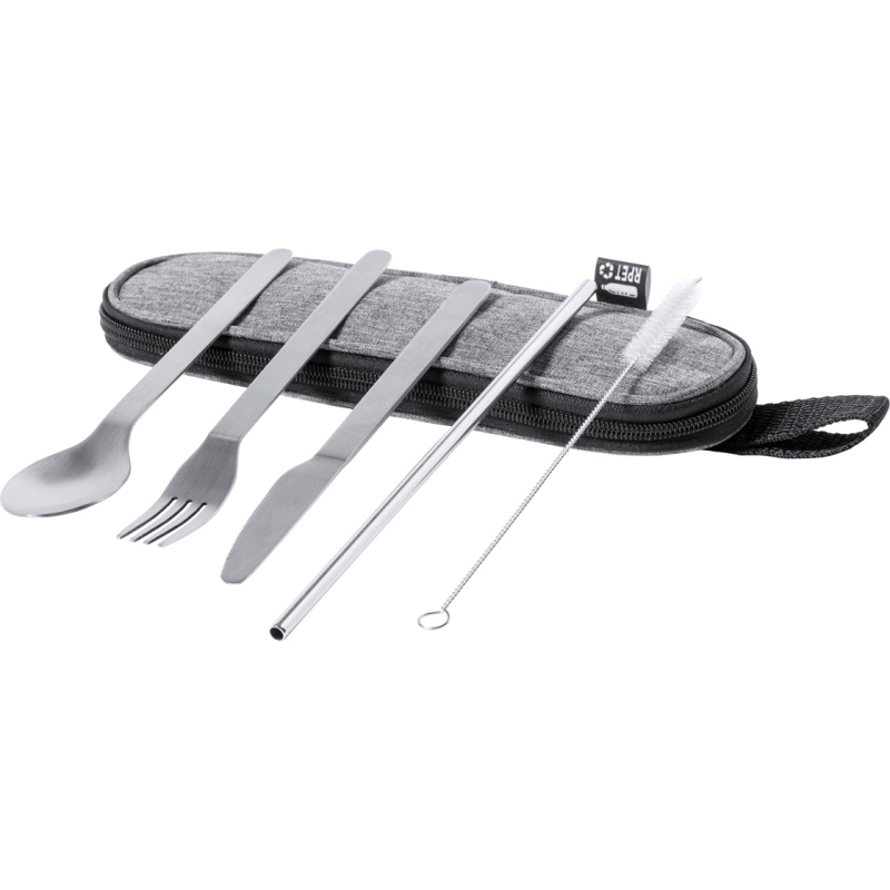 Set de 5 couverts en acier inoxydable dans une pochette en polyester RPET comprenant fourchette, couteau, cuillère, paille et brosse de nettoyage.