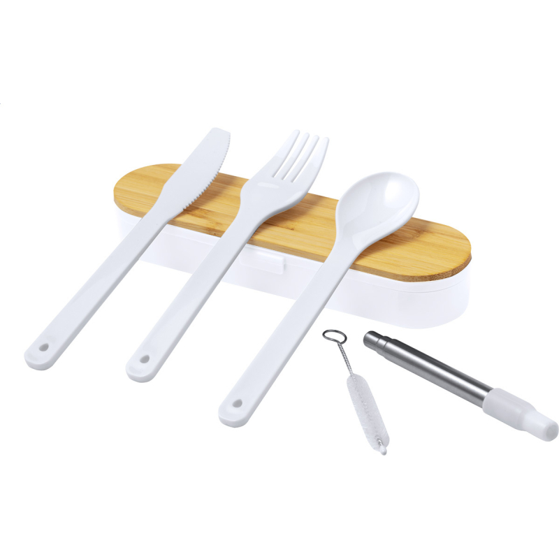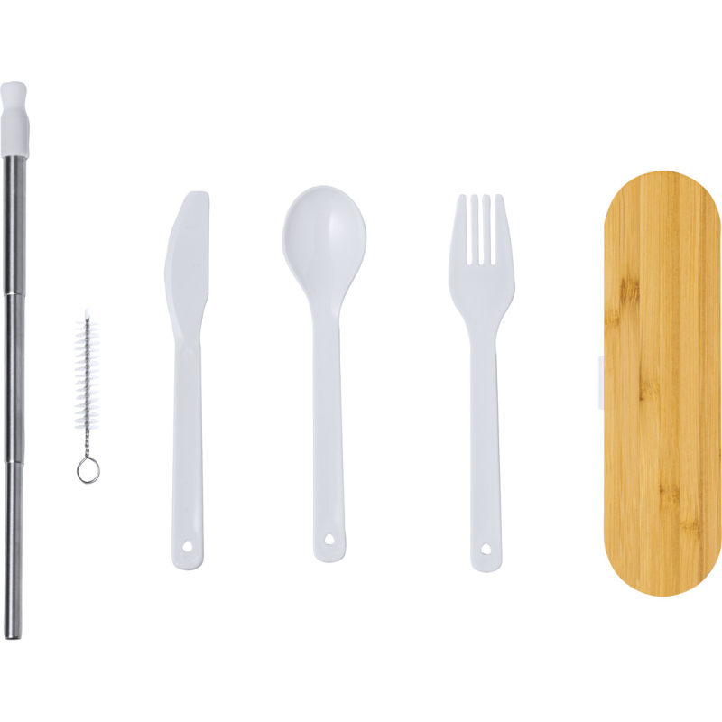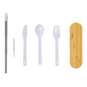 Set de couverts en plastique PP de 5 pièces dans une boîte à couvercle en bambou. Inclus : cuillère, fourchette, couteau, paille pliable en acier inoxydable et brosse de nettoyage.