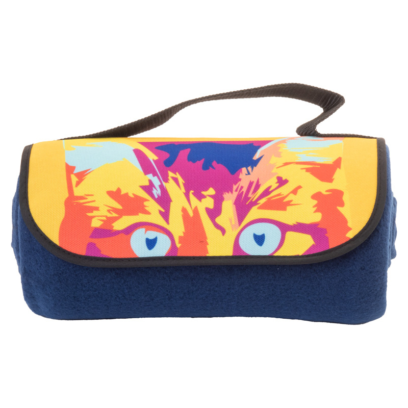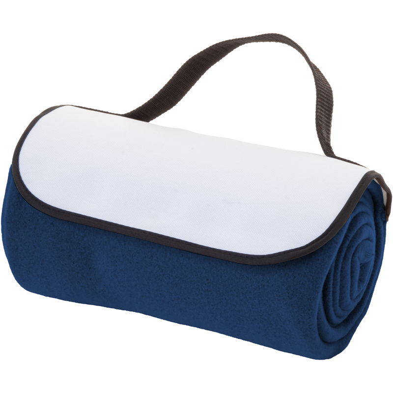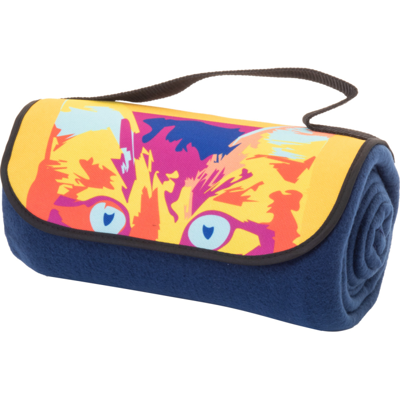 Couverture polaire RPET personnalisable (200 g/m²) avec poignée de transport velcro en polyester RPET 600D. Avec graphismes imprimés par sublimation et étiquette RPET distinctive. Quantité minimale : 50 pièces.