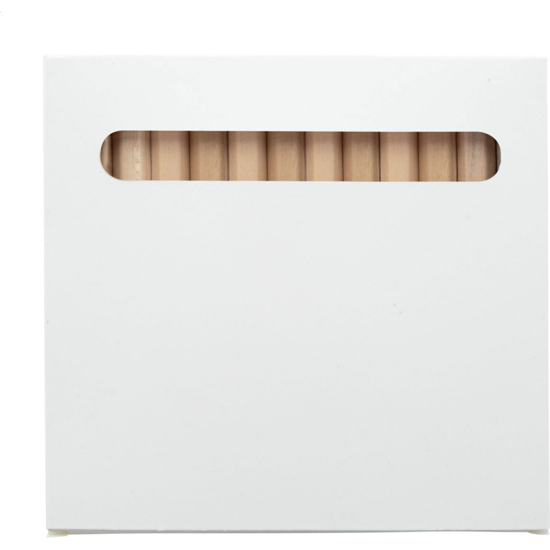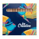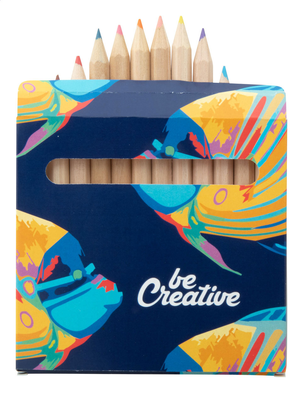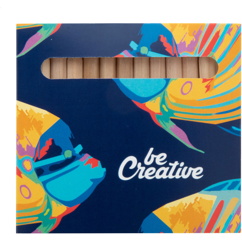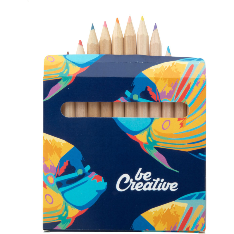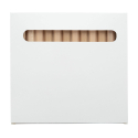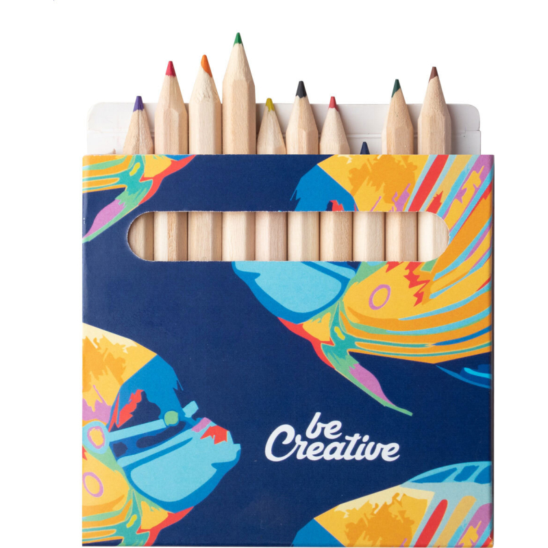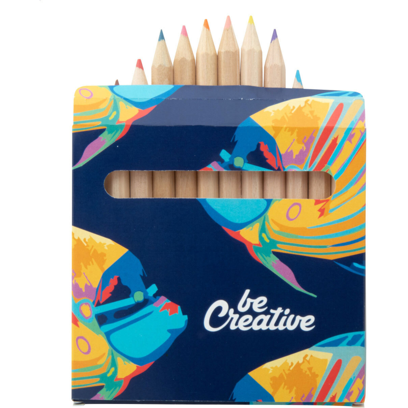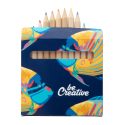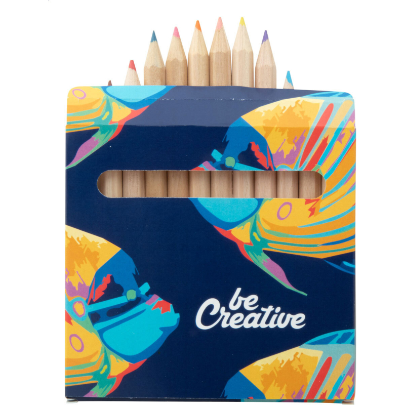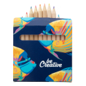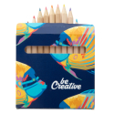 Set de 12 crayons de couleur en bois dans une boîte en papier personnalisable. Le prix inclut l'impression numérique. Quantité minimale: 100 pcs.
