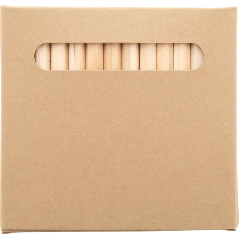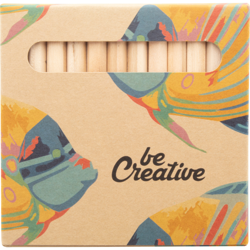Crayons de couleurs en bois (12 pièces) dans une boite en papier kraft avec impression quadri. Le prix inclut l´impression digitale. Quantité minimale : 100 pièces.