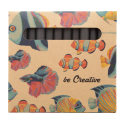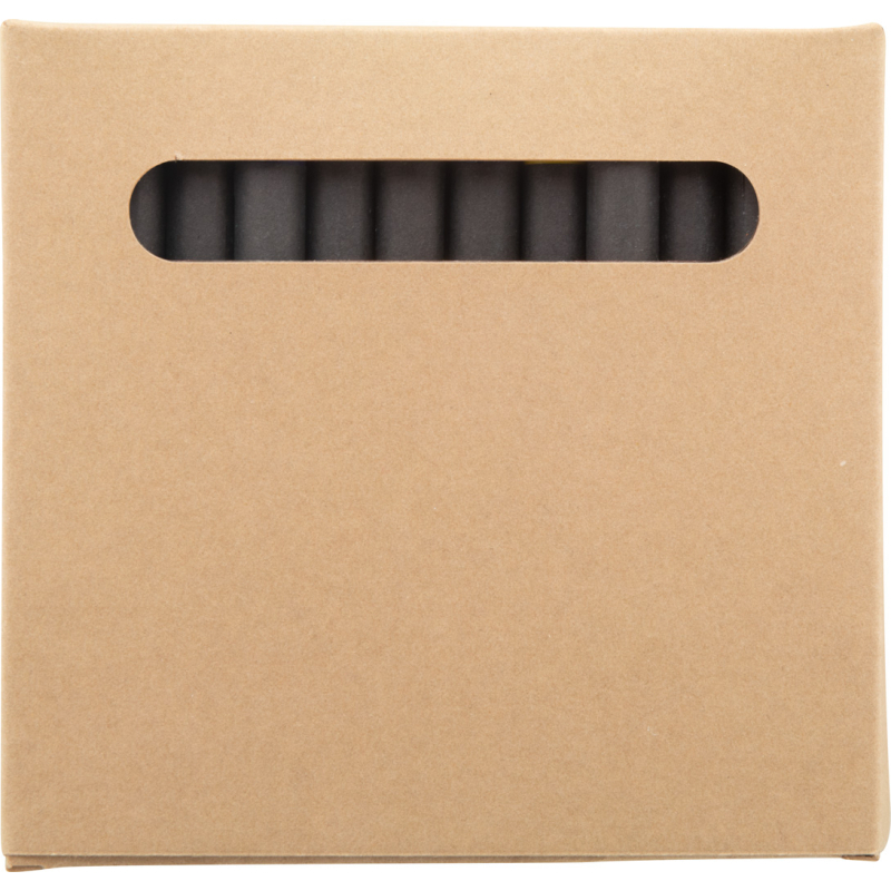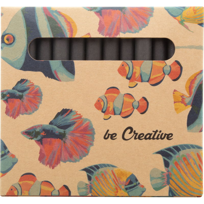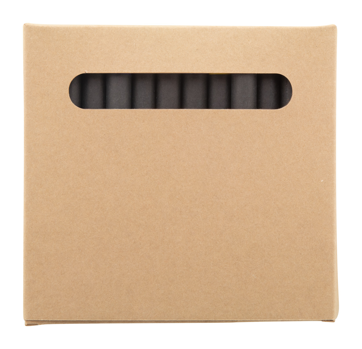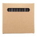 Recouvert de papier noir, crayons de couleurs (12 pièces) dans une boite en papier kraft avec impression quadri. Le prix inclut l´impression digitale. Quantité minimale : 100 pièces.