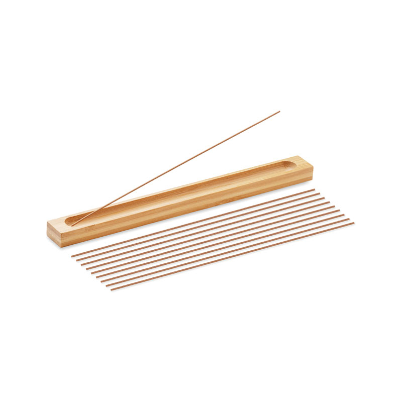 Set d'encens. Comprend 10 bâtonnets d'encens parfumés au bois de santal et un support en bambou.