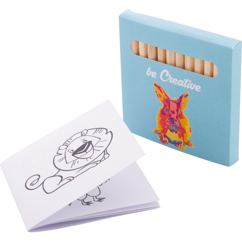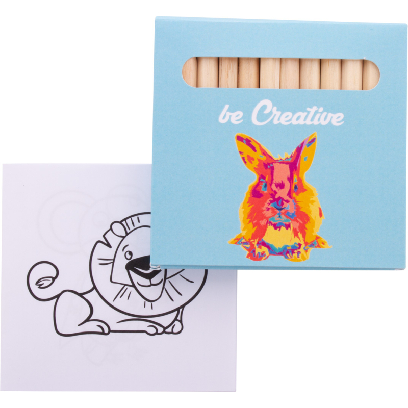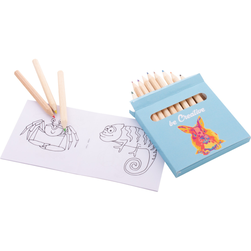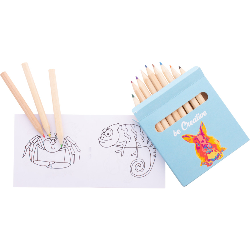 Jeu de coloriage sur mesure dans une boîte en papier impression en quadri. Comprend des crayons de couleur en bois (12 pièces) et un livre de coloriage thématique. Quantité minimale : 100 pièces.