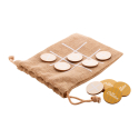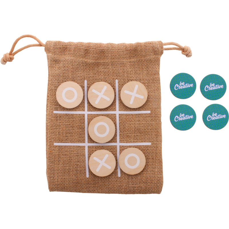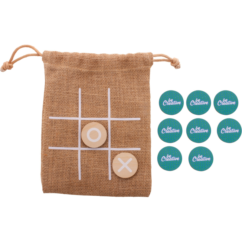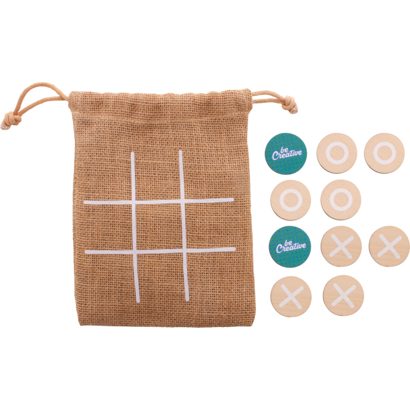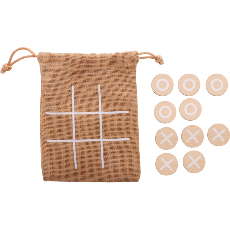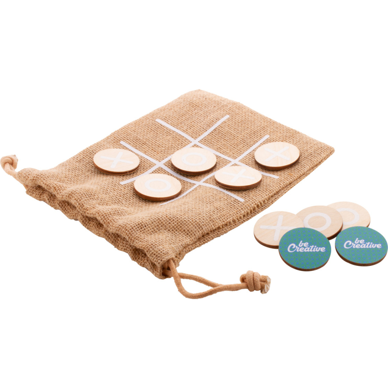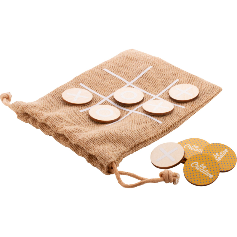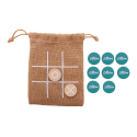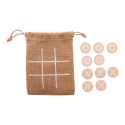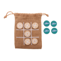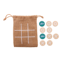 Jeu de morpions sur mesure en contreplaqué de bouleau avec 10 jetons et étui en jute. Le prix comprend une impression couleur identique au verso de tous les jetons. Quantité minimale : 100 pièces.