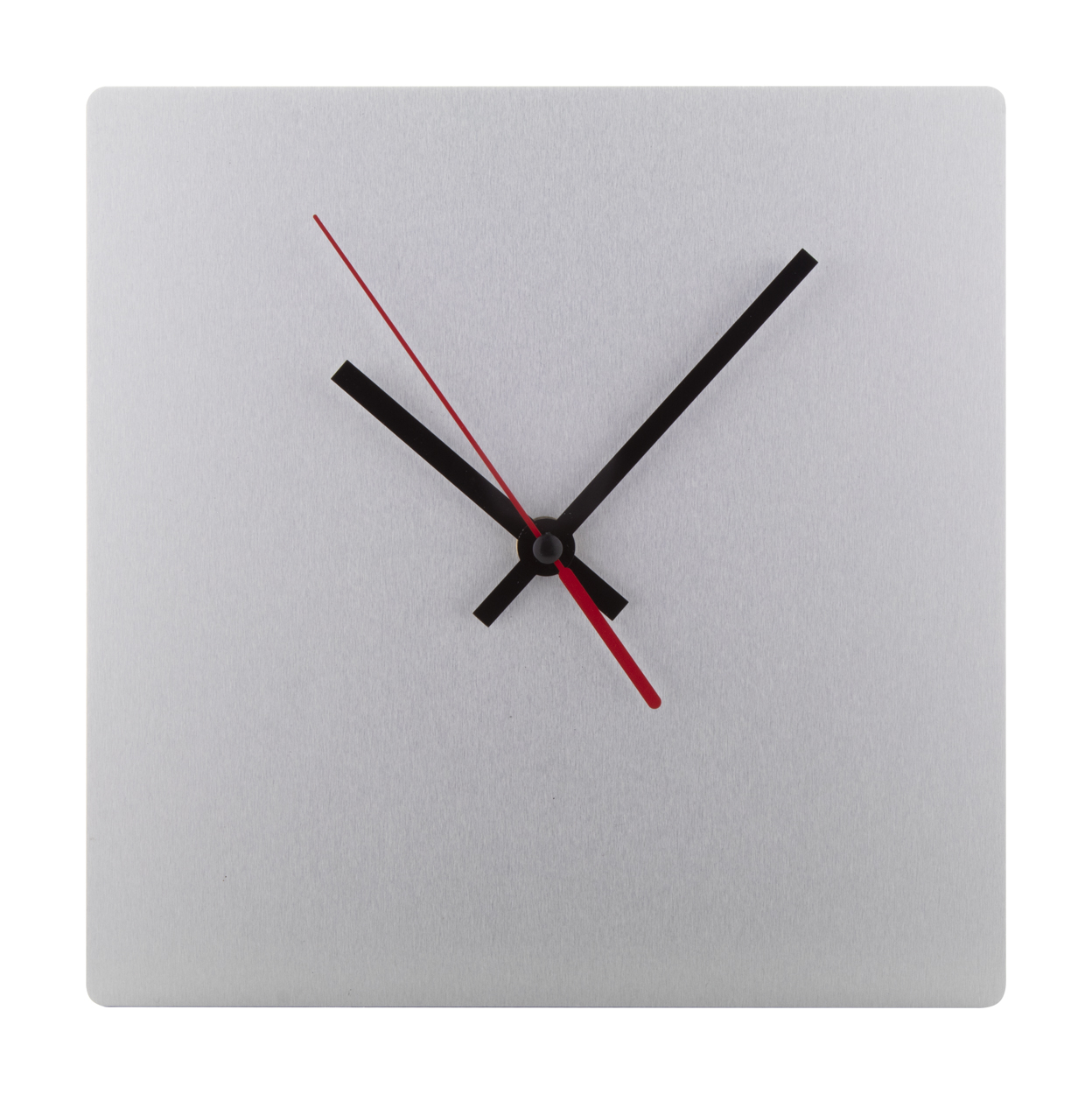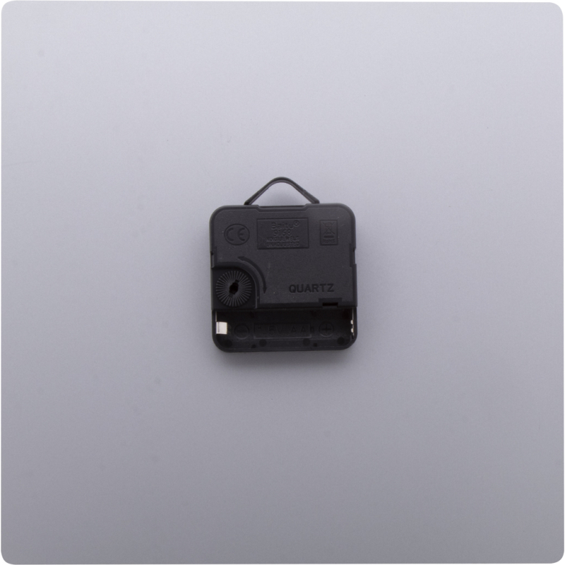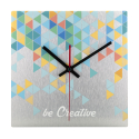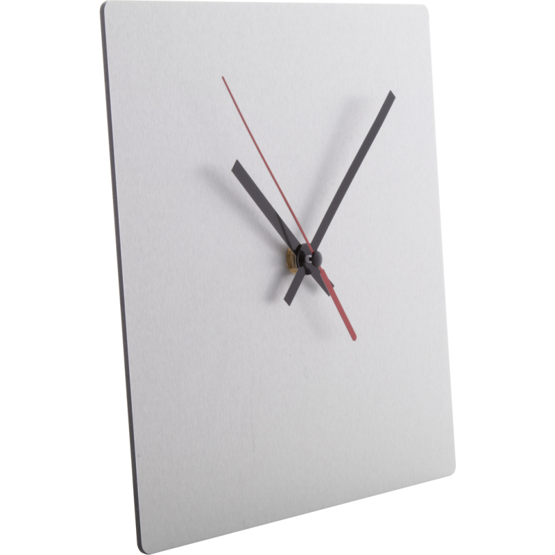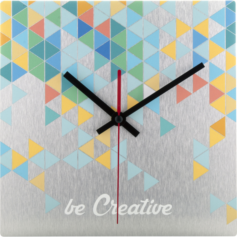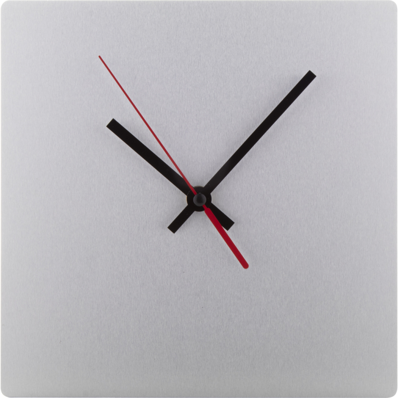 Pendule murale composite en aluminium brossé sur mesure avec impression quadri de forme carrée. Fonctionne avec 1 pile AA, livrée sans pile. Le prix comprend l'impression LED UV. Quantité minimum : 25 pièces.