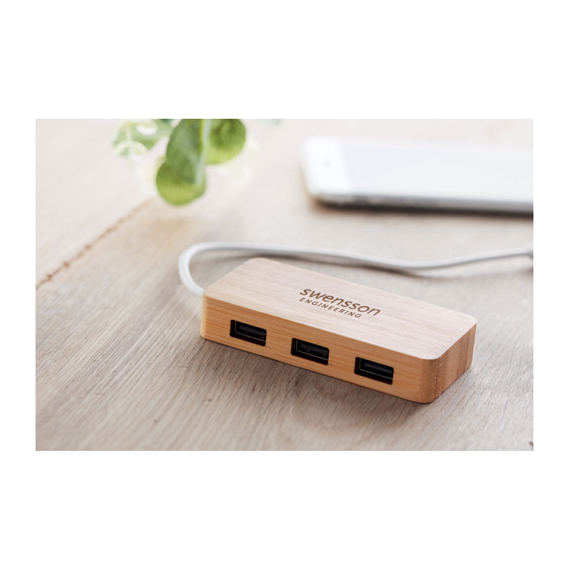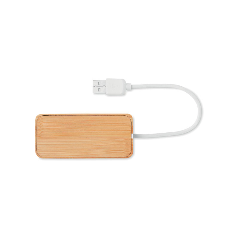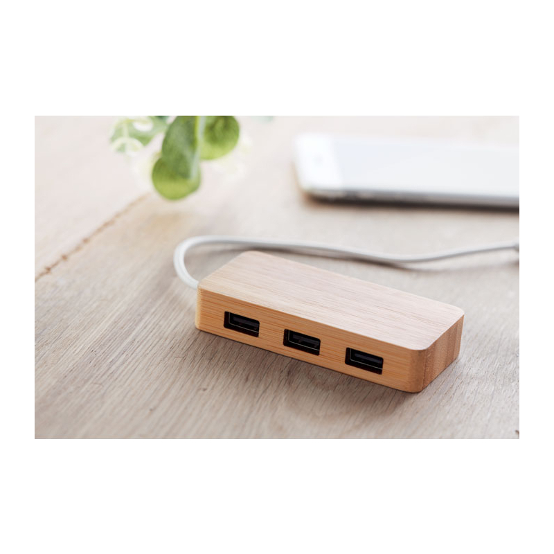 Hub USB 3 ports 2.0 dans un boîtier en bambou. Longueur du câble 18,5 cm. Le bambou est un produit naturel, et présente de légères variations de couleur, de décoration et de tailles.