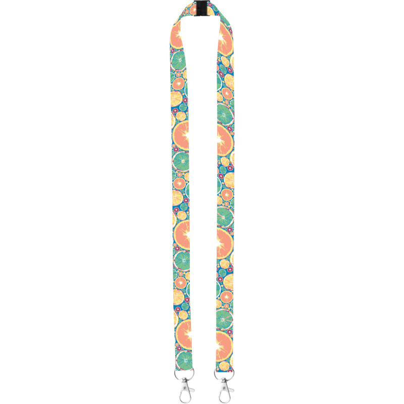 Tour de cou en polyester avec 2 mousquetons en métal et système anti-étranglement. Grâce à la sublimation le logo peut être imprimé sur les deux côtés. Quantité minimale: 100 pcs.
