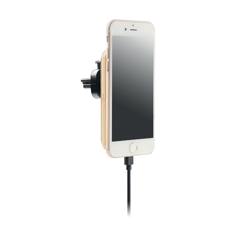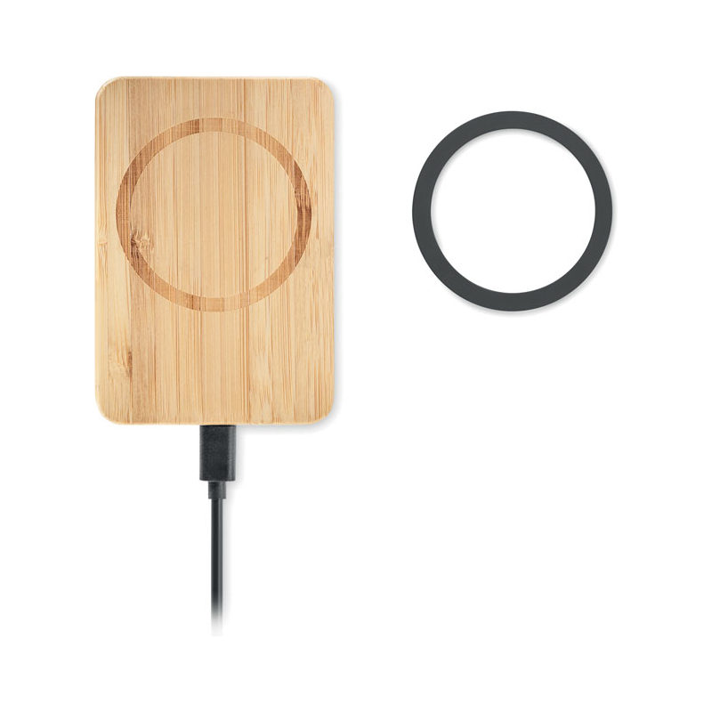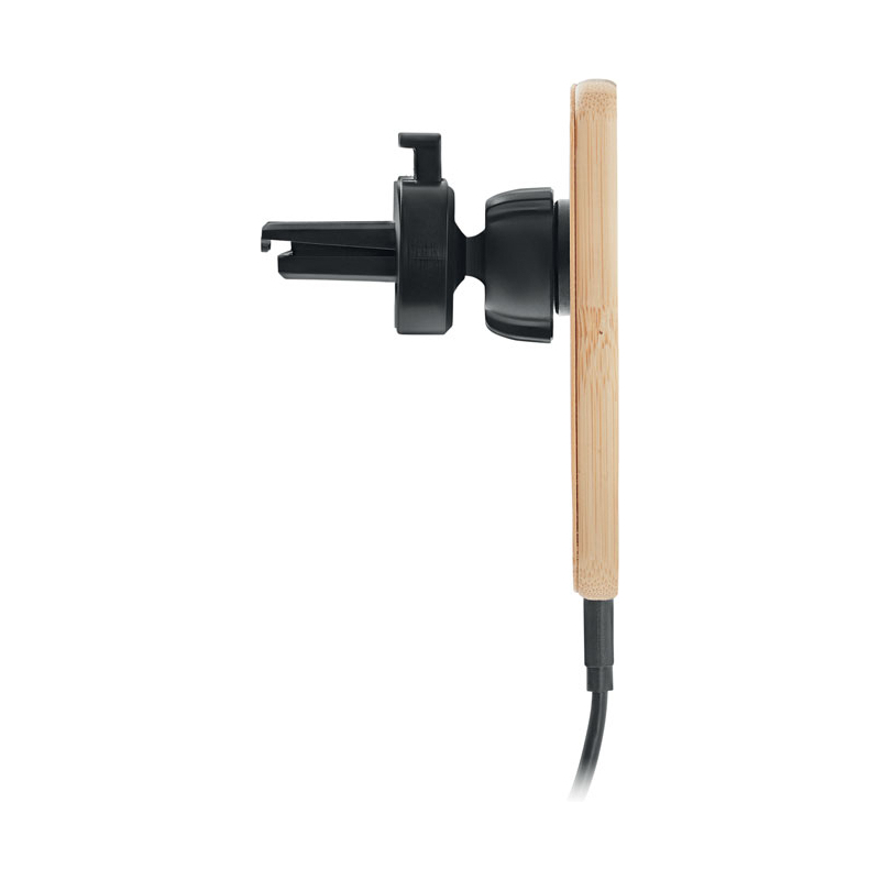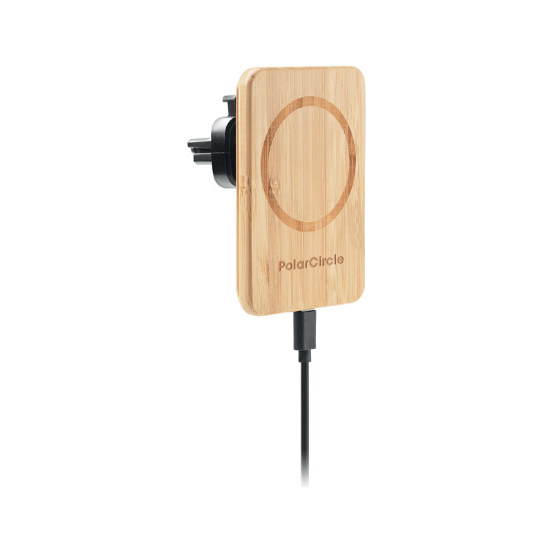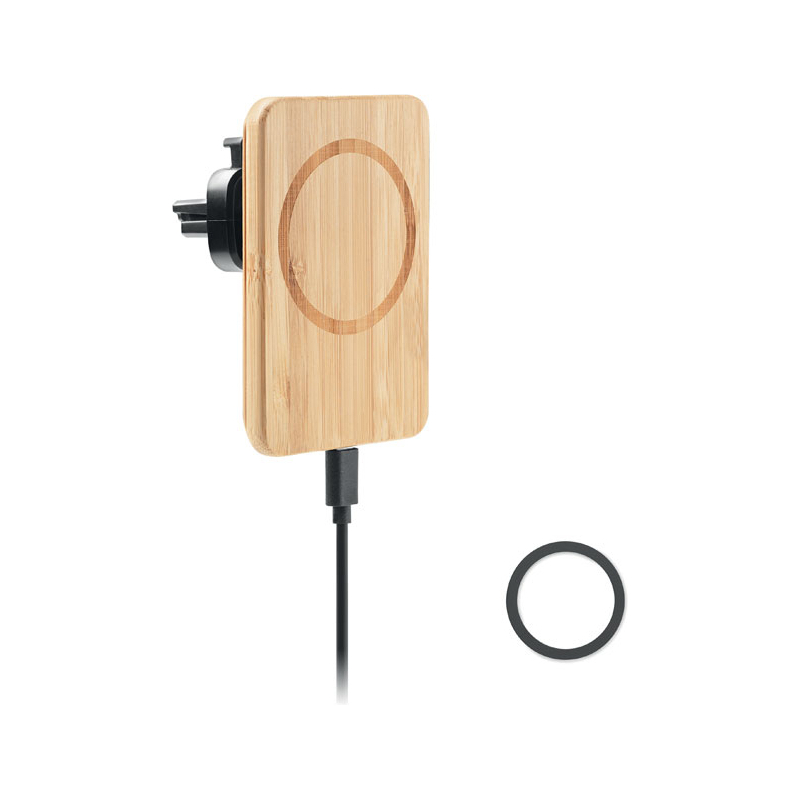 Chargeur sans fil magnétique en bambou avec support pour voiture. Sortie : DC 9V/1.67A (15W) pour une charge rapide. Compatible avec l'iPhone® 12 et plus récent. Comprend un anneau métallique magnétique supplémentaire pour permettre la recharge d'autres téléphones sans fil non magnétiques.