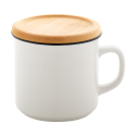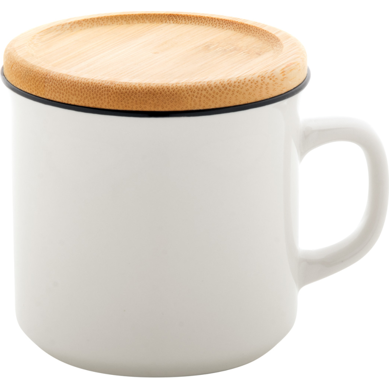 Mug vintage en porcelaine de haute qualité, de couleur blanche avec rebord noir et dessous de verre en bambou. 320 ml. Livré dans une boîte cadeau.