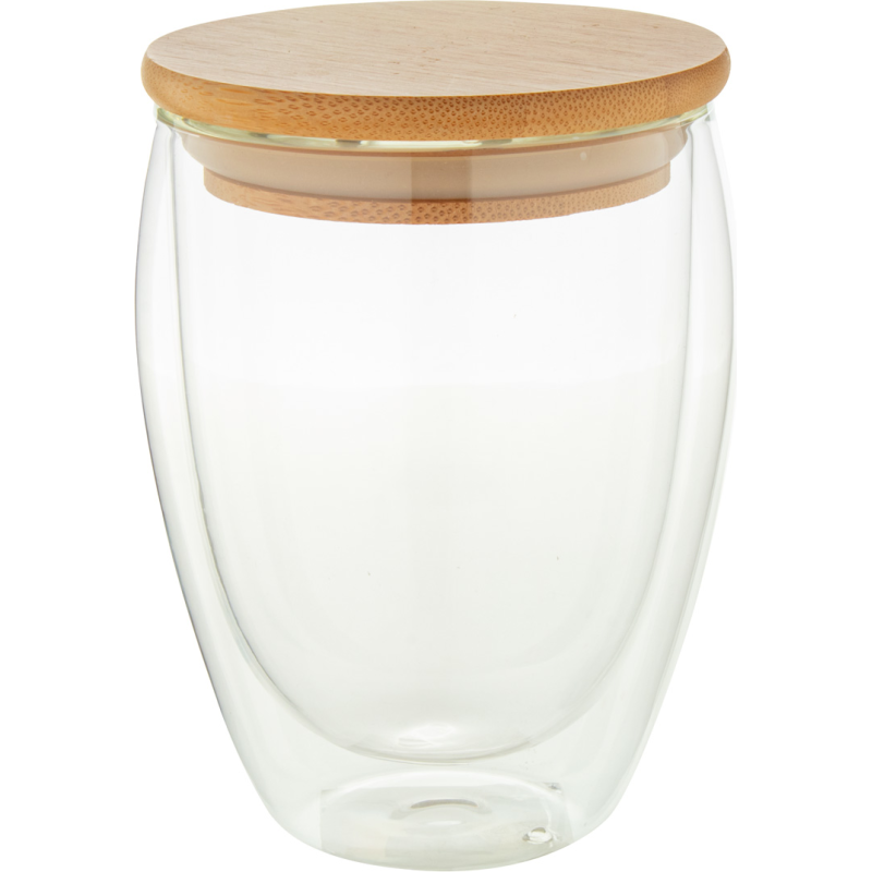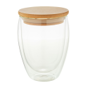 Mug thermos en verre borosilicate à double paroi avec couvercle en bambou, 450 ml. Dans une boite en papier kraft.