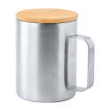 Mug double paroi en acier inoxydable avec anse et couvercle en bambou, 350 ml.