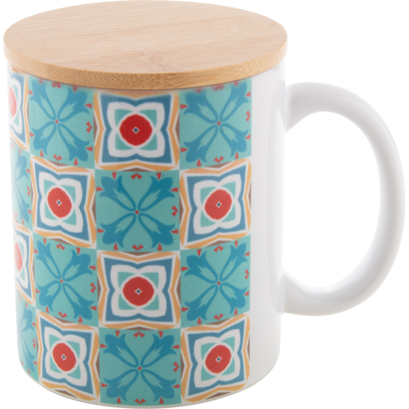 Mug en céramique blanc impression en sublimation 300 ml et son couvercle en bambou. Livré dans une boîte en papier kraft. Le prix comprend l'impression en sublimation. Quantité minimale : 50 pièces.
