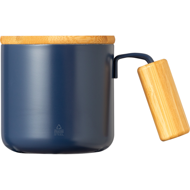 Mug thermos en acier inoxydable recyclé à double paroi avec poignée et couvercle en bambou. 330 ml.