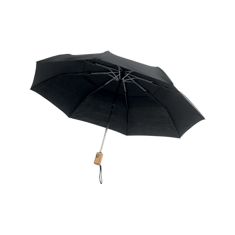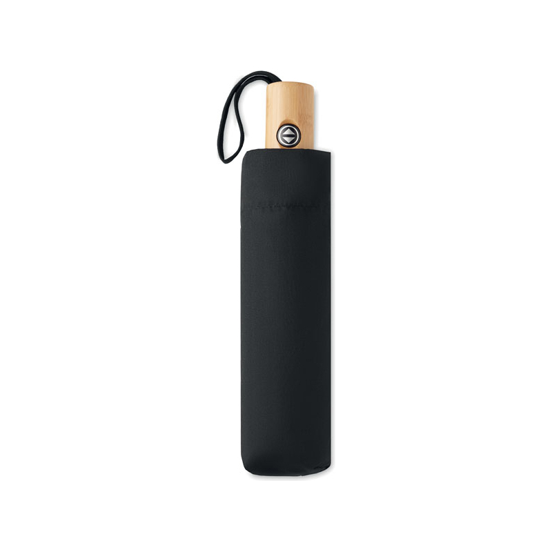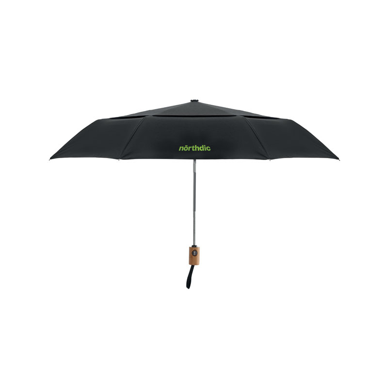 Parapluie tempête 21'', 2 plis, fermeture automatique, en polycoton 190T (70% de polyester, 30% coton) avec mât en aluminium, embouts et poignée en bambou. Baleines en fibre de verre noire. Pochette assortie.