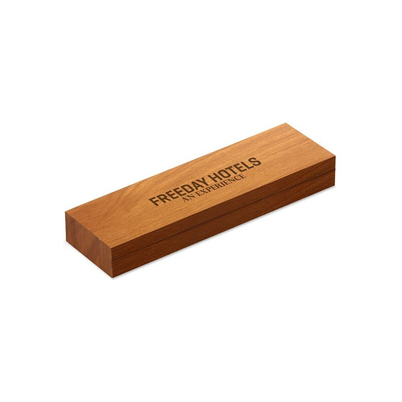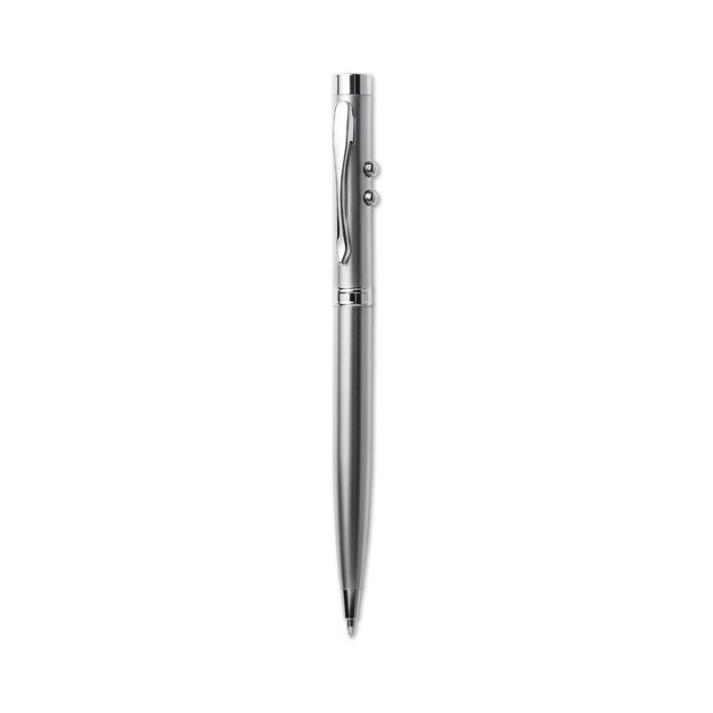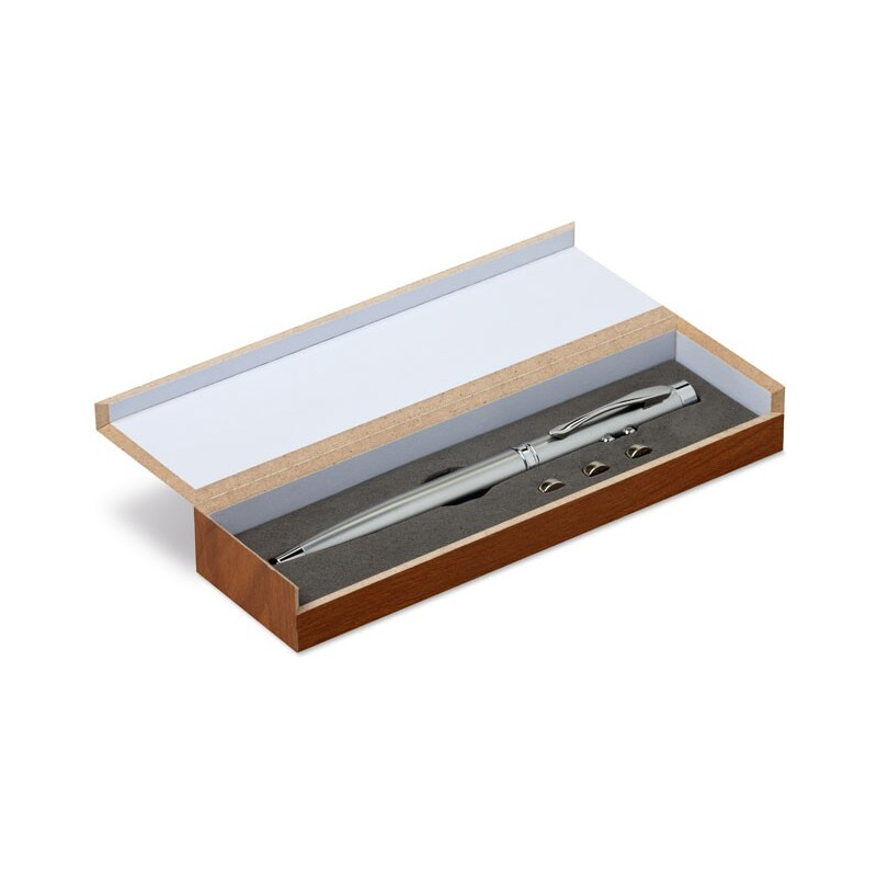 Stylo argenté multifonctions. Encre bleue, LED blanche, pointeur laser rouge. Inclut 3 piles boutons . Présenté dans un coffret bois. Safety class II.