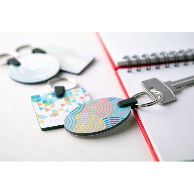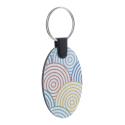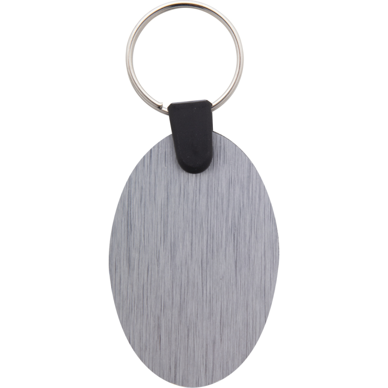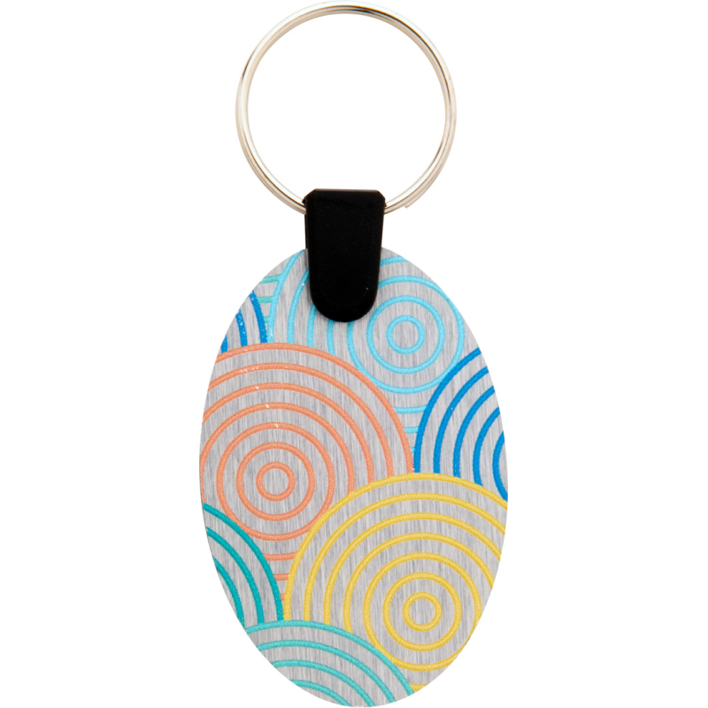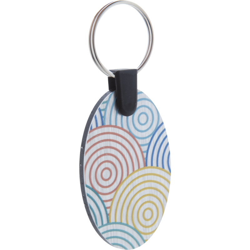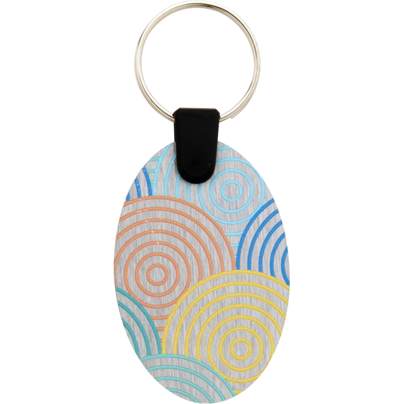 Porte-clés composite ovale en aluminium brossé avec impression quadri. Le prix comprend l'impression LED UV d'un côté. Quantité minimum: 100 pièces.