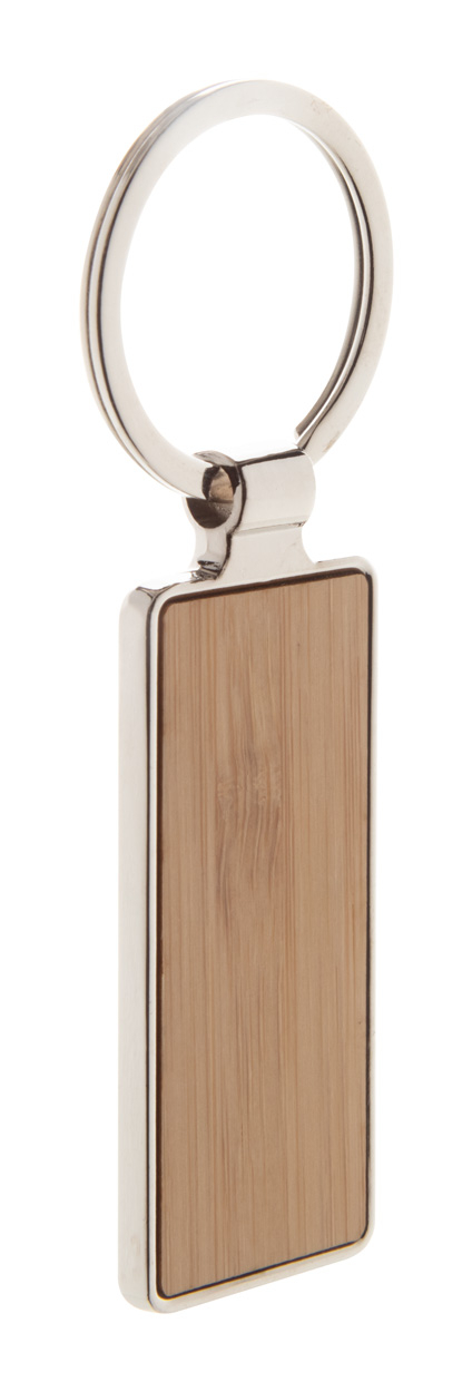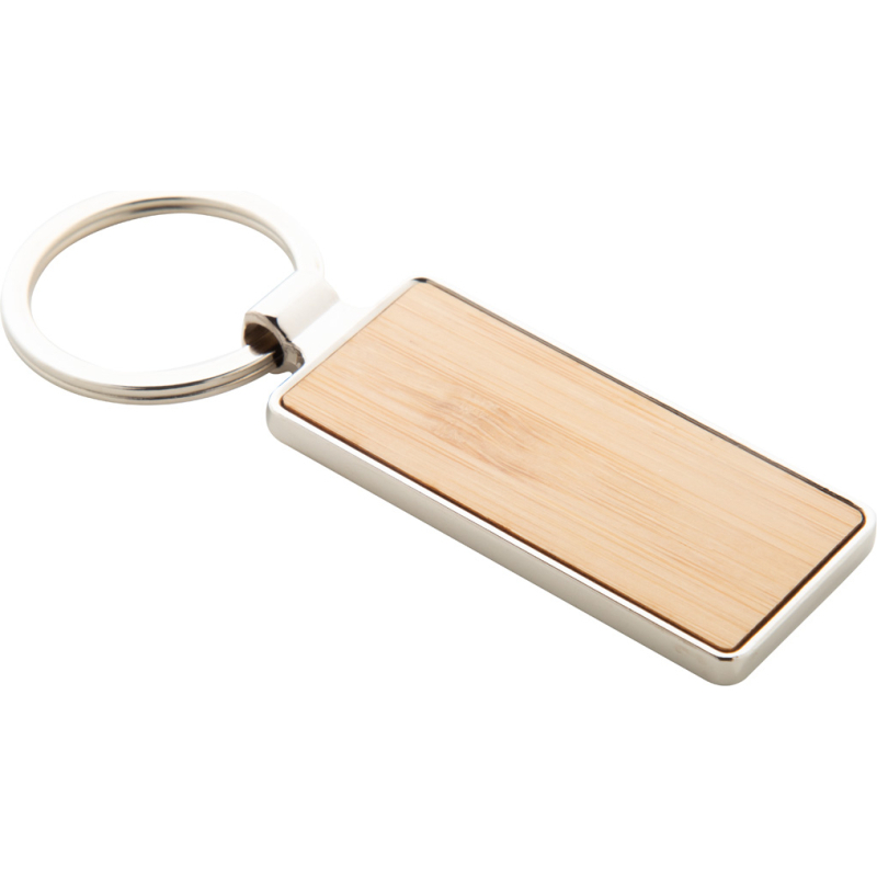 Porte-clés en métal de forme rectangulaire avec insert en bambou. Livré dans une boîte en papier kraft.